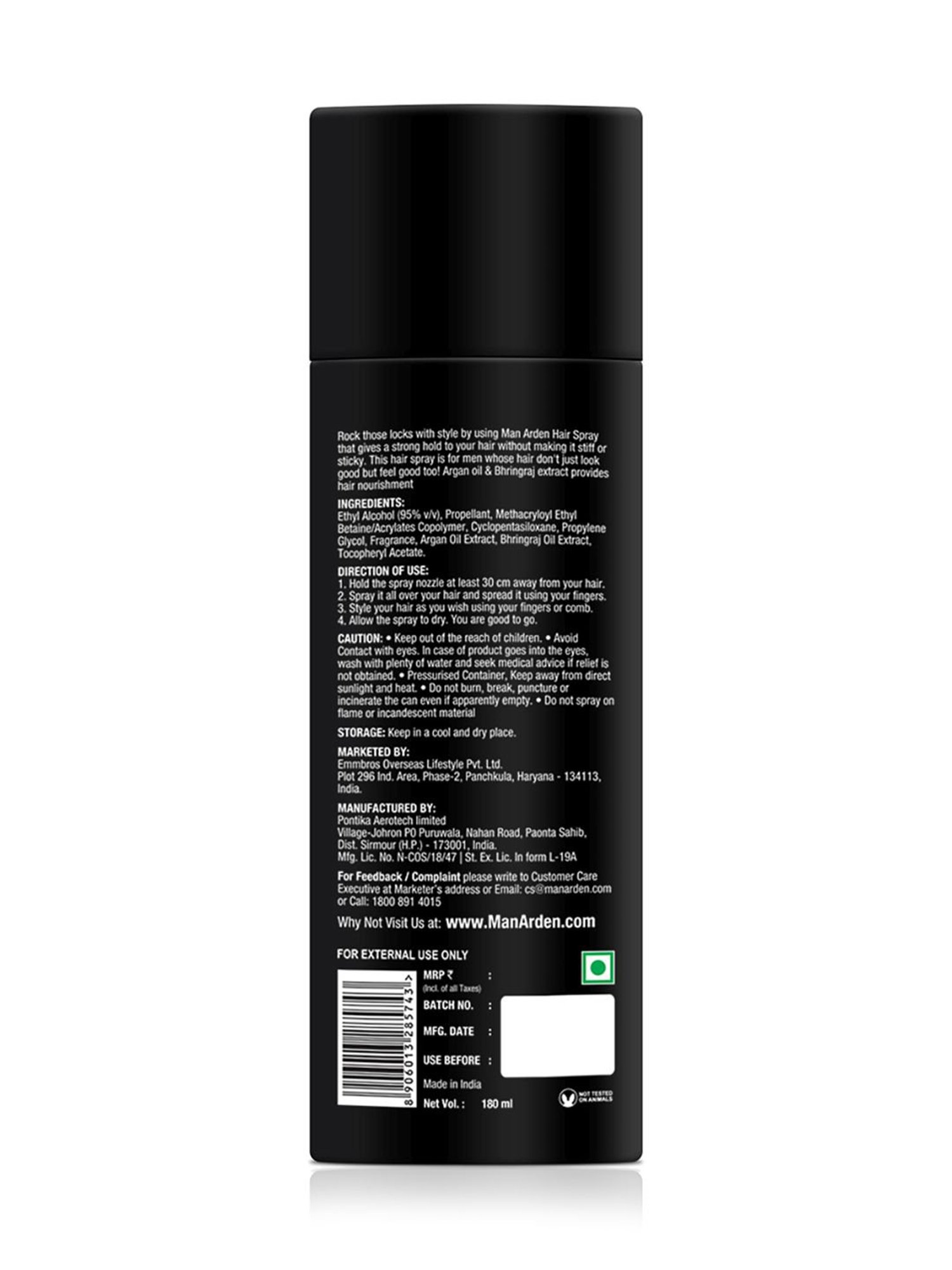 Composition: Ethyl Alcohol (95% v/v), Propellant, Methacryloyl Ethyl Betaine/Acrylates Copolymer, Cyclopentasiloxane, Propylene Glycol, Fragrance, Argan Oil Extract, Bhringraj Oil Extract, Tocopheryl Acetate.