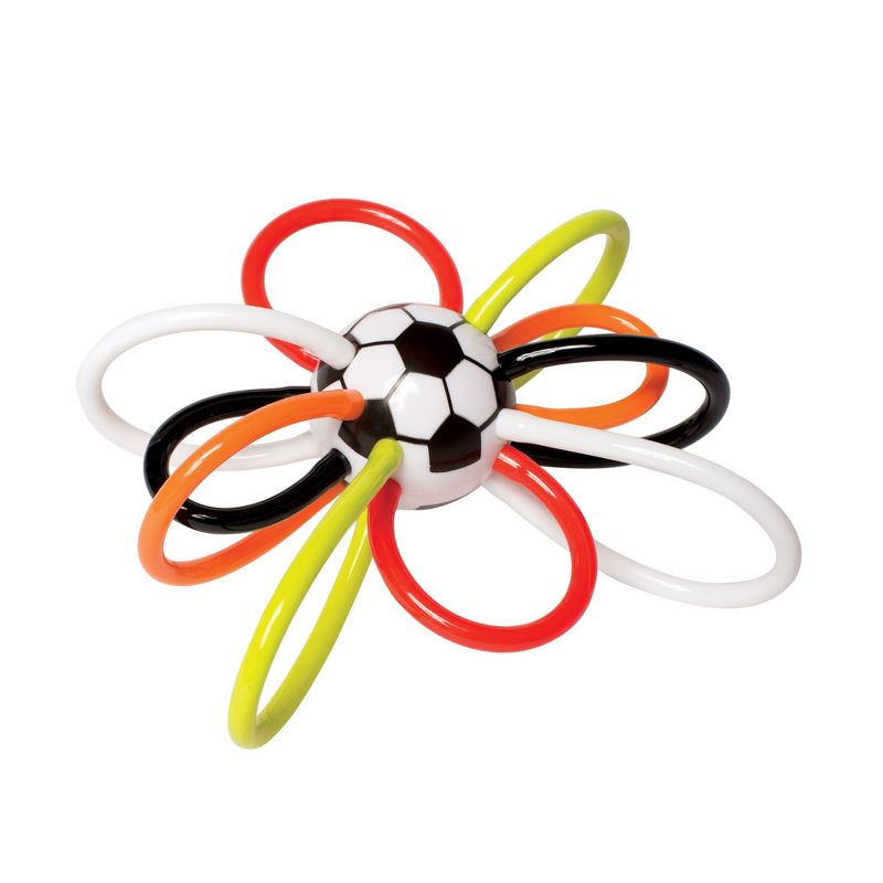 The classic Winkel now has a little sports cousin! Pass along your affinity for sports and fitness with this attractive teether centered on a plastic soccer ball. Based on the award winning classic Winkel rattle and teether design by Manhattan Toy. Its maze of soft, continuous tubes and its stunning colors instantly capture and hold baby’s attention. The mesmerizing loop design and lightweight construction make it very easy for little hands to grab, hold and rattle – a perfect clutching toy to engage baby’s gross motor skills. The center piece features a soccer ball rattle so baby can explore sound and cause and effect. The soft, pliable loops are made of PU tubing (polyurethane) and are free of BPA or PVC. Soccer Winkel can also be refrigerated to provide a more soothing experience for particularly sore baby gums and teeth. Winkel’s patented design and developmental features have made it a baby favorite, parent “go to” for over 20 years. Since 1979, Manhattan Toy has been making award-winning, high quality, educational toys for your baby, toddler or kid. From infant toys and baby toys to sensory development toys, our goal is to provide the safest and best toys available. All of our products, from the newest concepts to our time-tested classics, are innovatively designed to inspire imaginative play and are routinely safety tested to pass strict CPSC, ASTM, EN71 and Health Canada safety standards.
