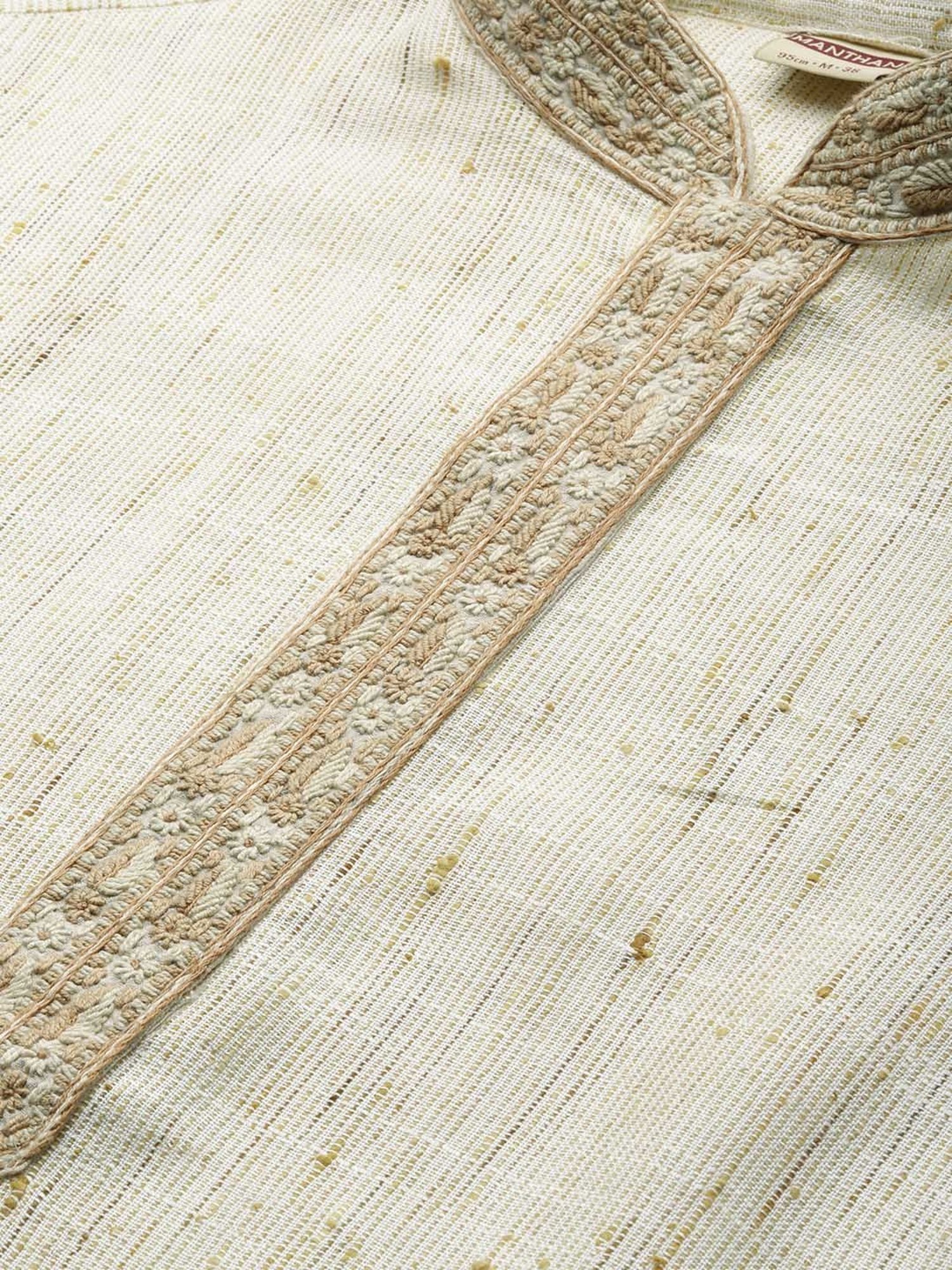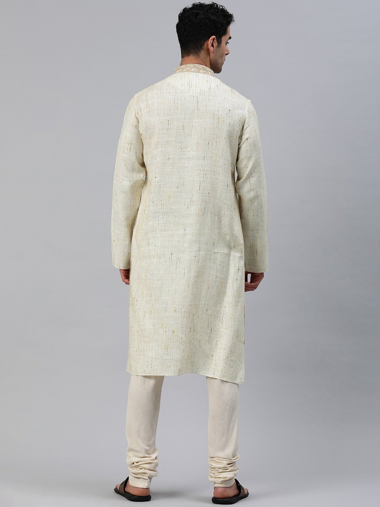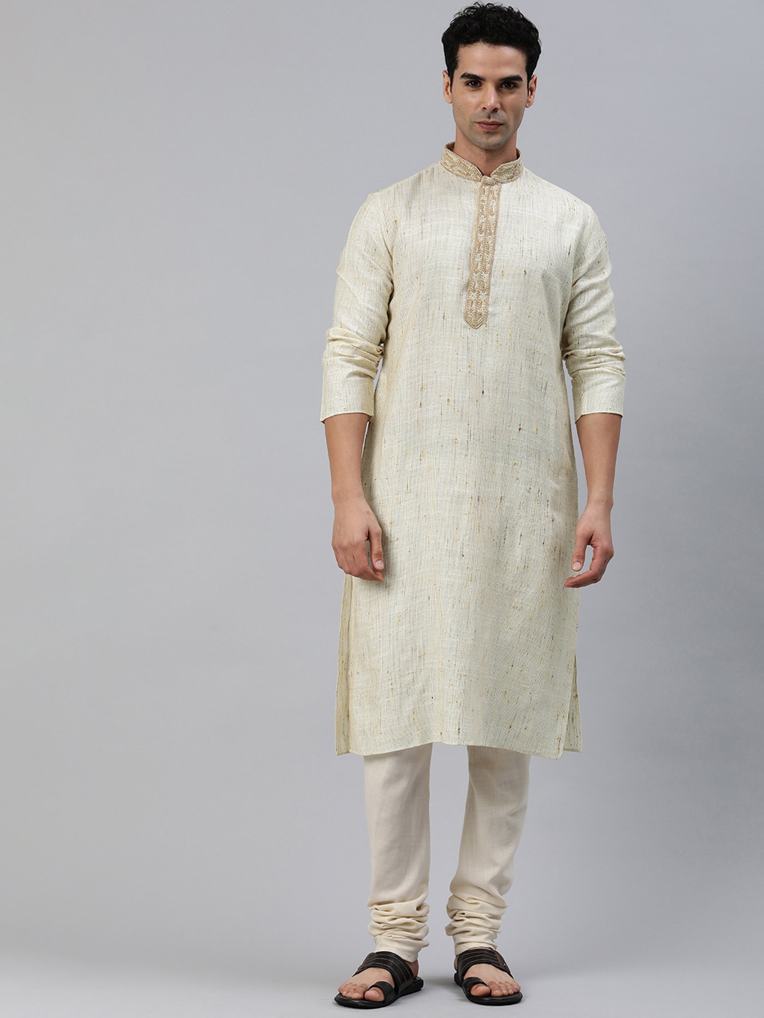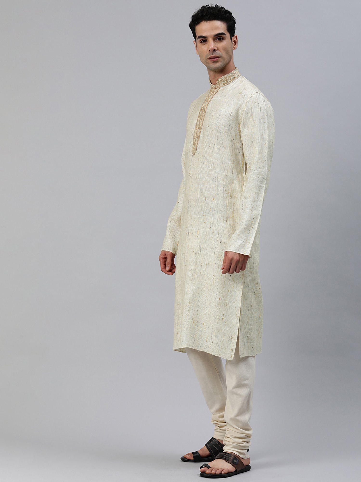 Give your ethnic-wear line-up a cool upgrade with this beautiful cream mandarin collar kurta from the latest collection of Manthan. Artfully tailored in prime grade viscose blend for gentle softness and subtle sheen replete with a nice drape and excellent comfort, it's classic regular fit cut and versatile self design pattern make it a natural choice for many an evening. Pair it with a contrast Nehru jacket for a stunning ensemble.