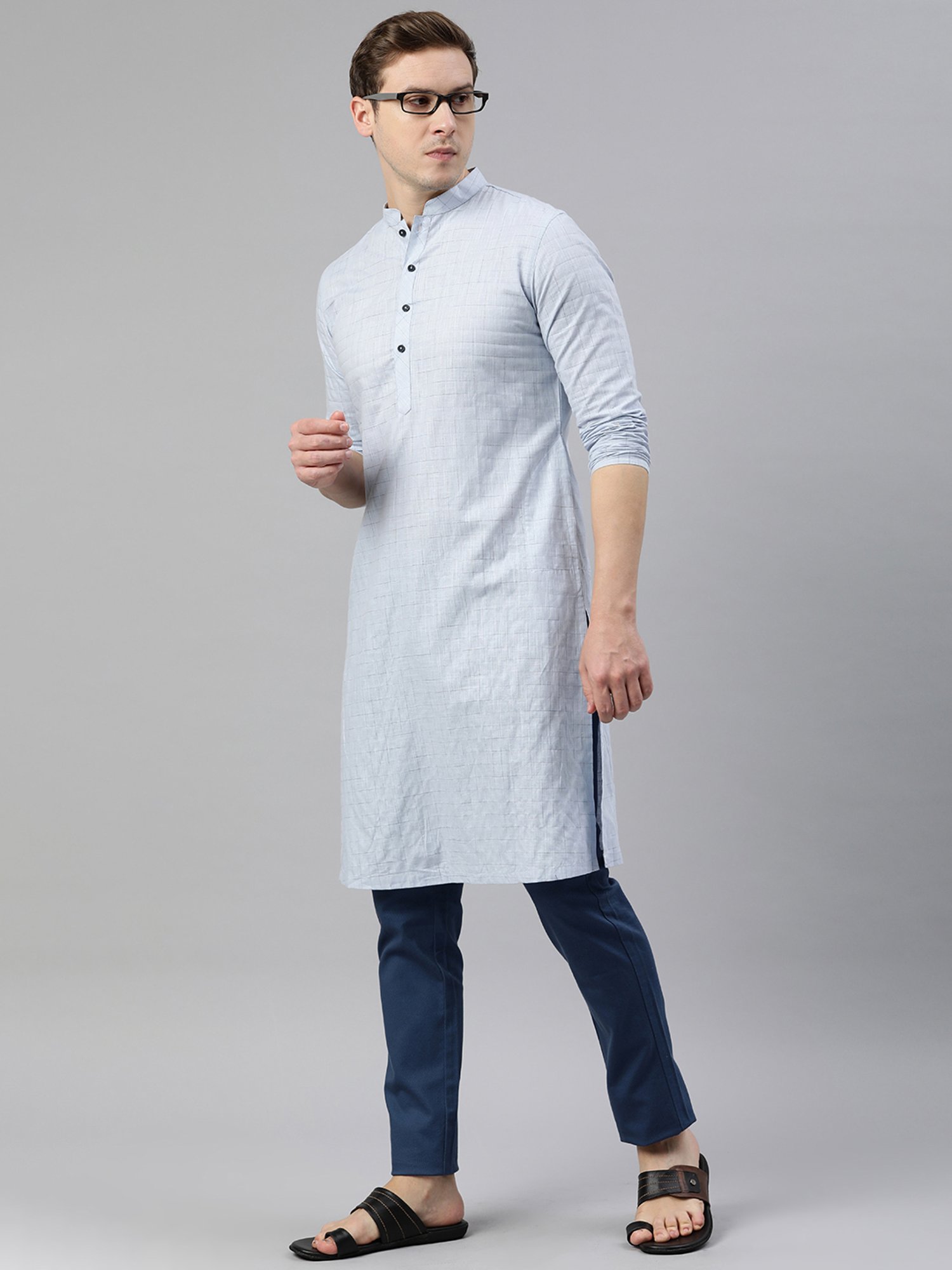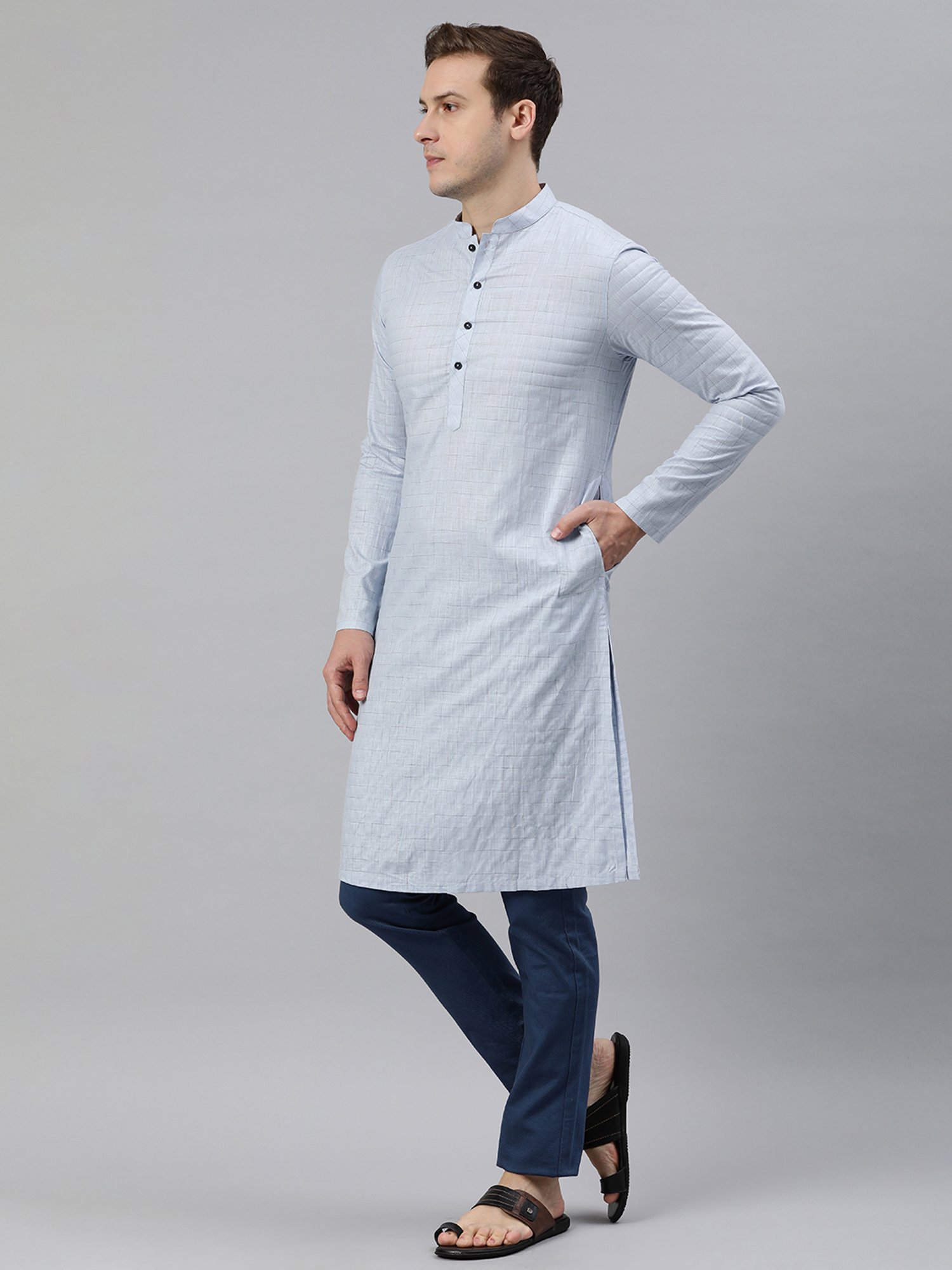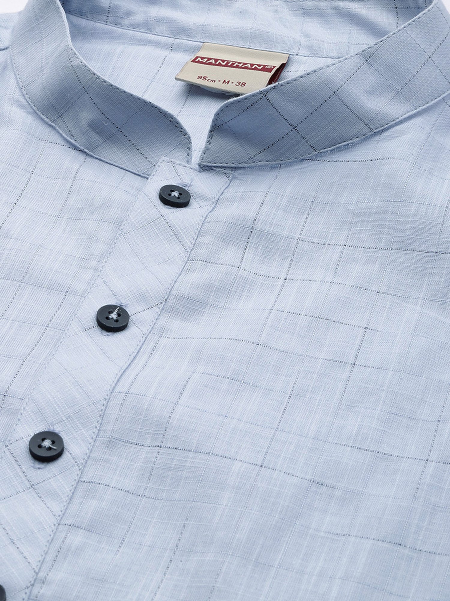 Prepare to welcome the festivities of the season with fresh fashion hues in this beautiful light blue mandarin collar kurta from the latest collection of Manthan. Artfully tailored in superior quality cotton for natural lustre and a nice drape coupled with a soft feel and excellent comfort, it's classic regular fit cut and versatile check pattern are bound to add elegance to any occasion. Pair it with a contrast Nehru jacket to enhance it's flair.