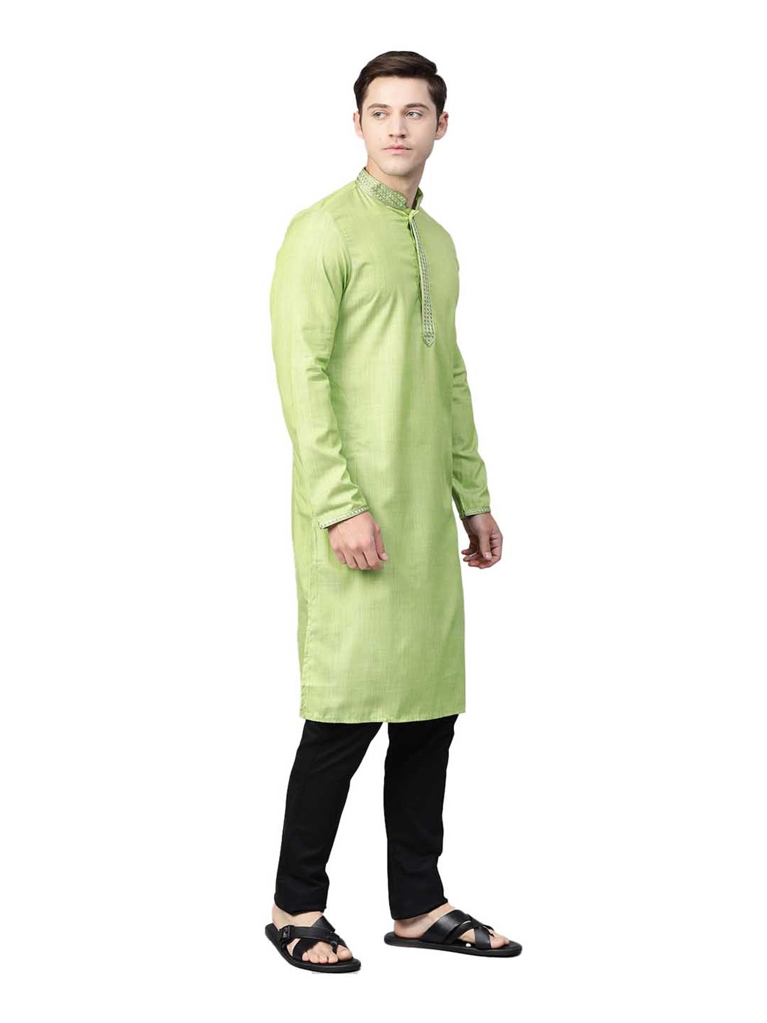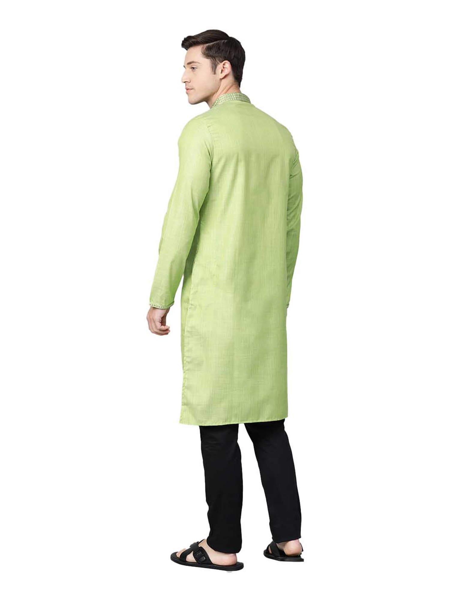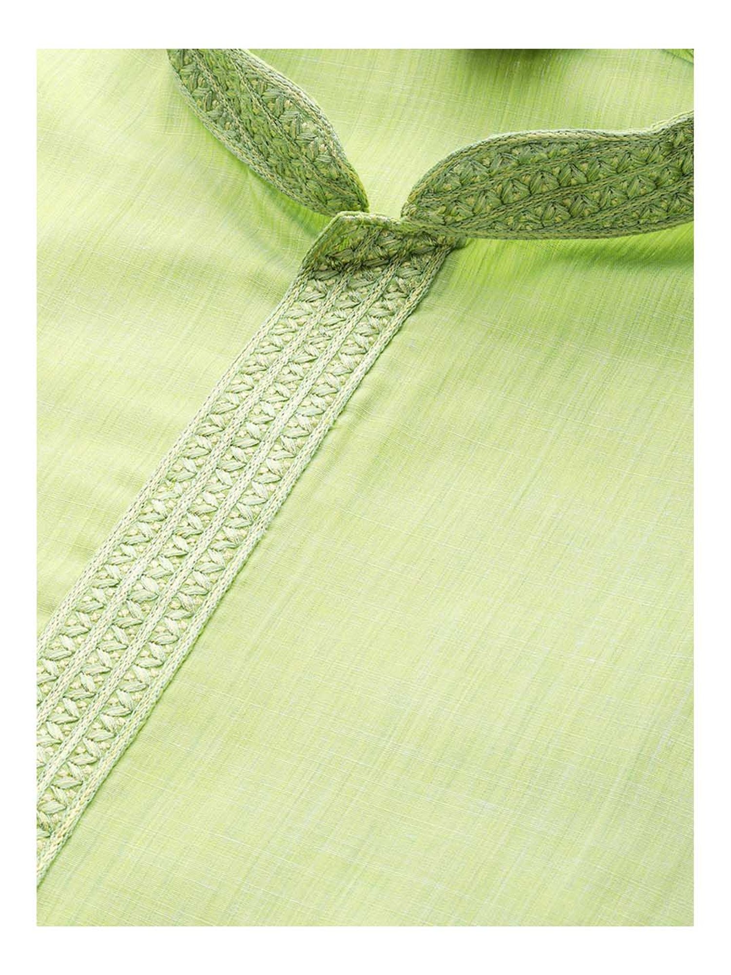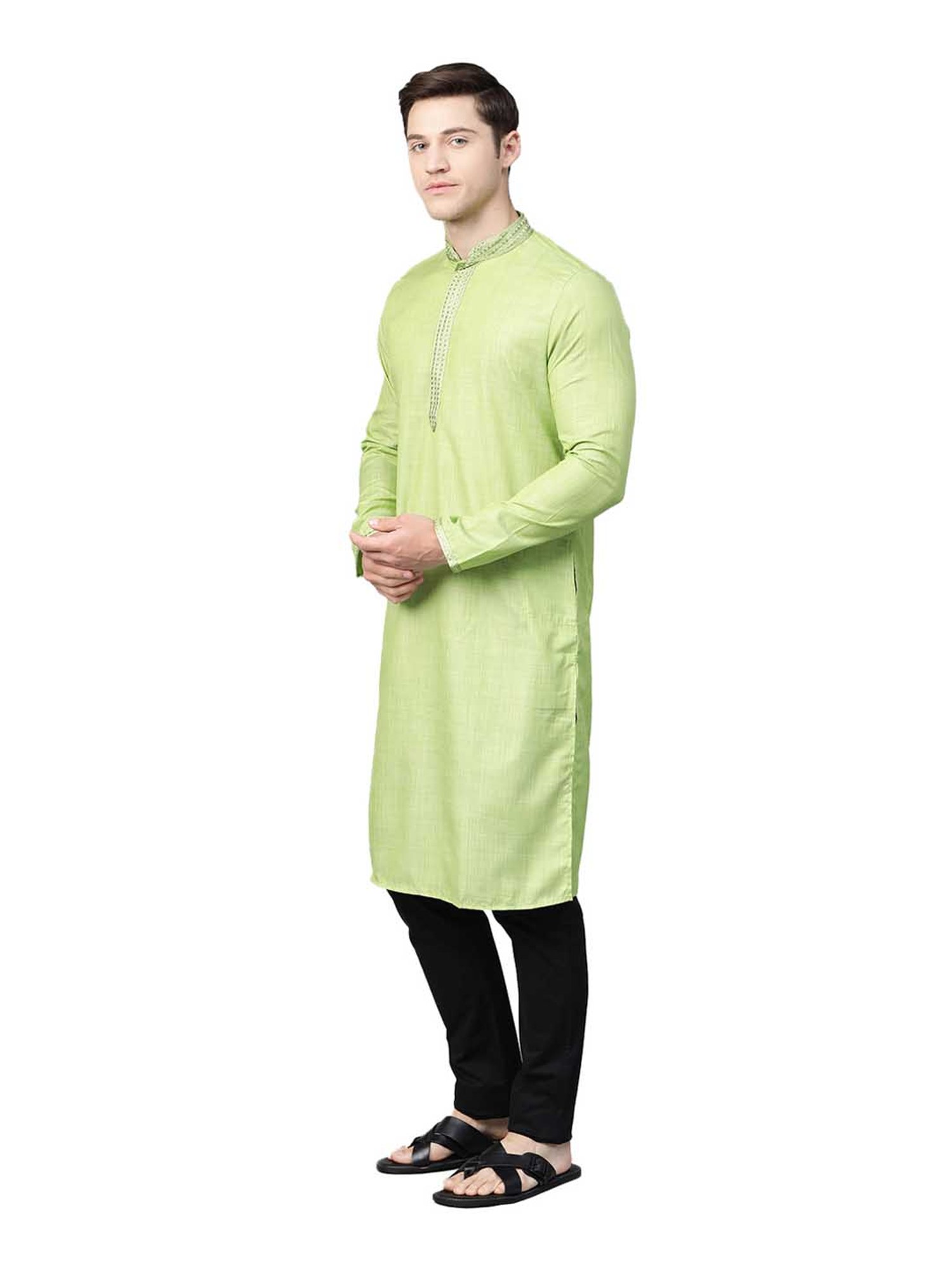 Flaunt a classic style when you wear this pistachio kurta from Manthan. Crafted using a cotton blend fabric, this solid kurta comes with full sleeves and a mandarin collar. Tag this regular fit kurta with pyjama pants and juttis.
