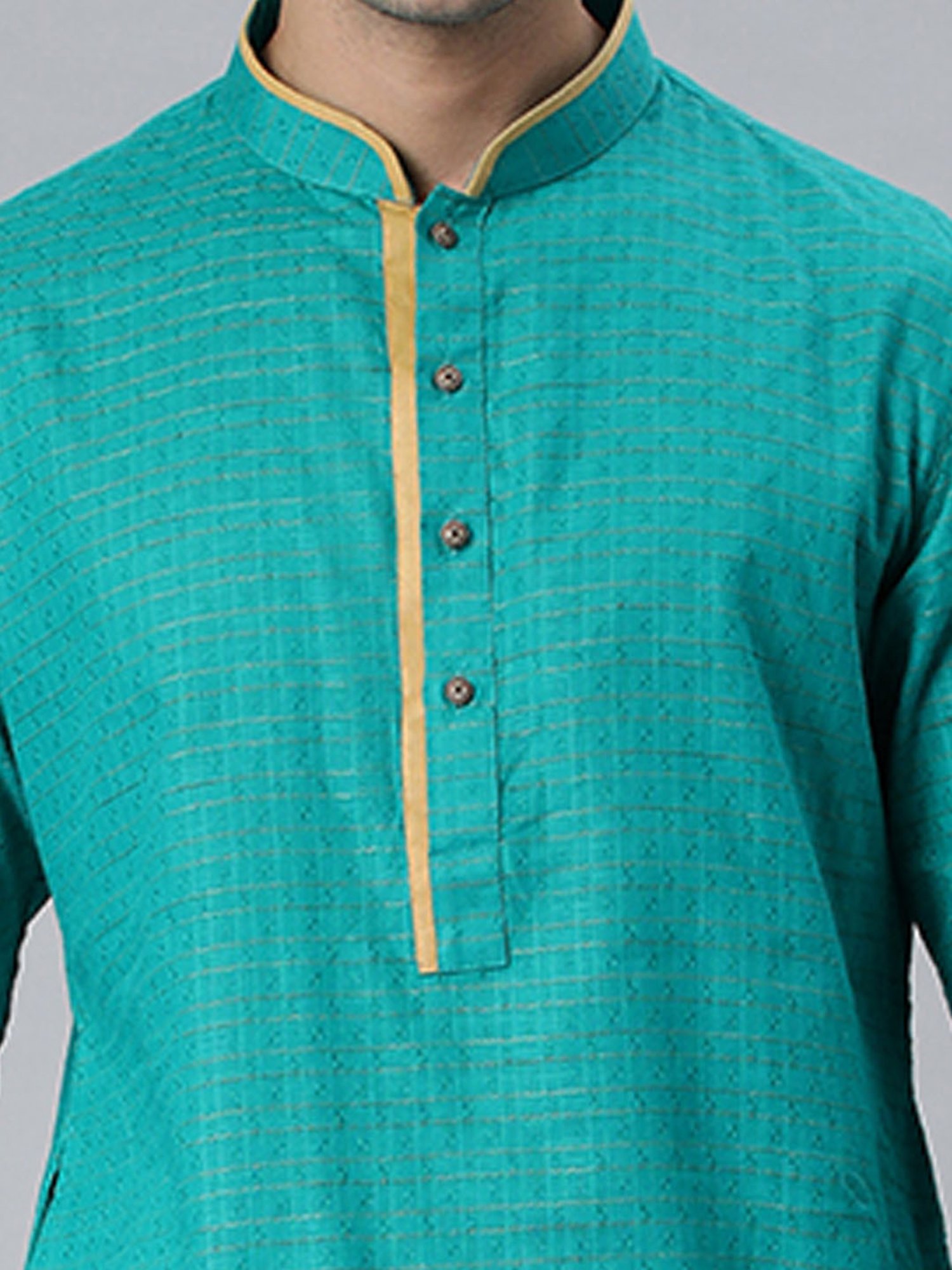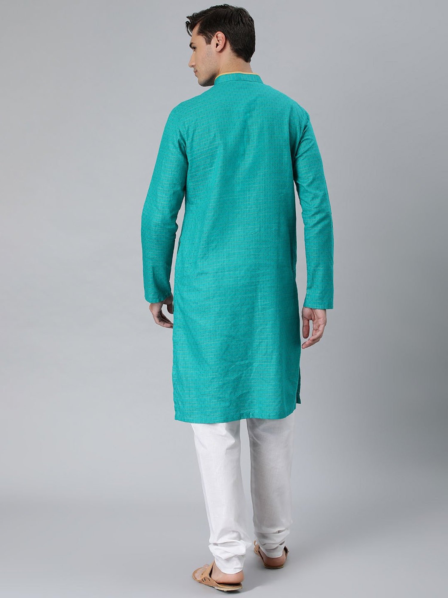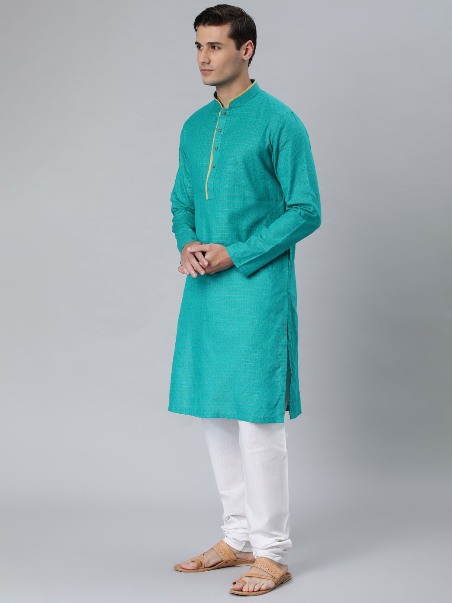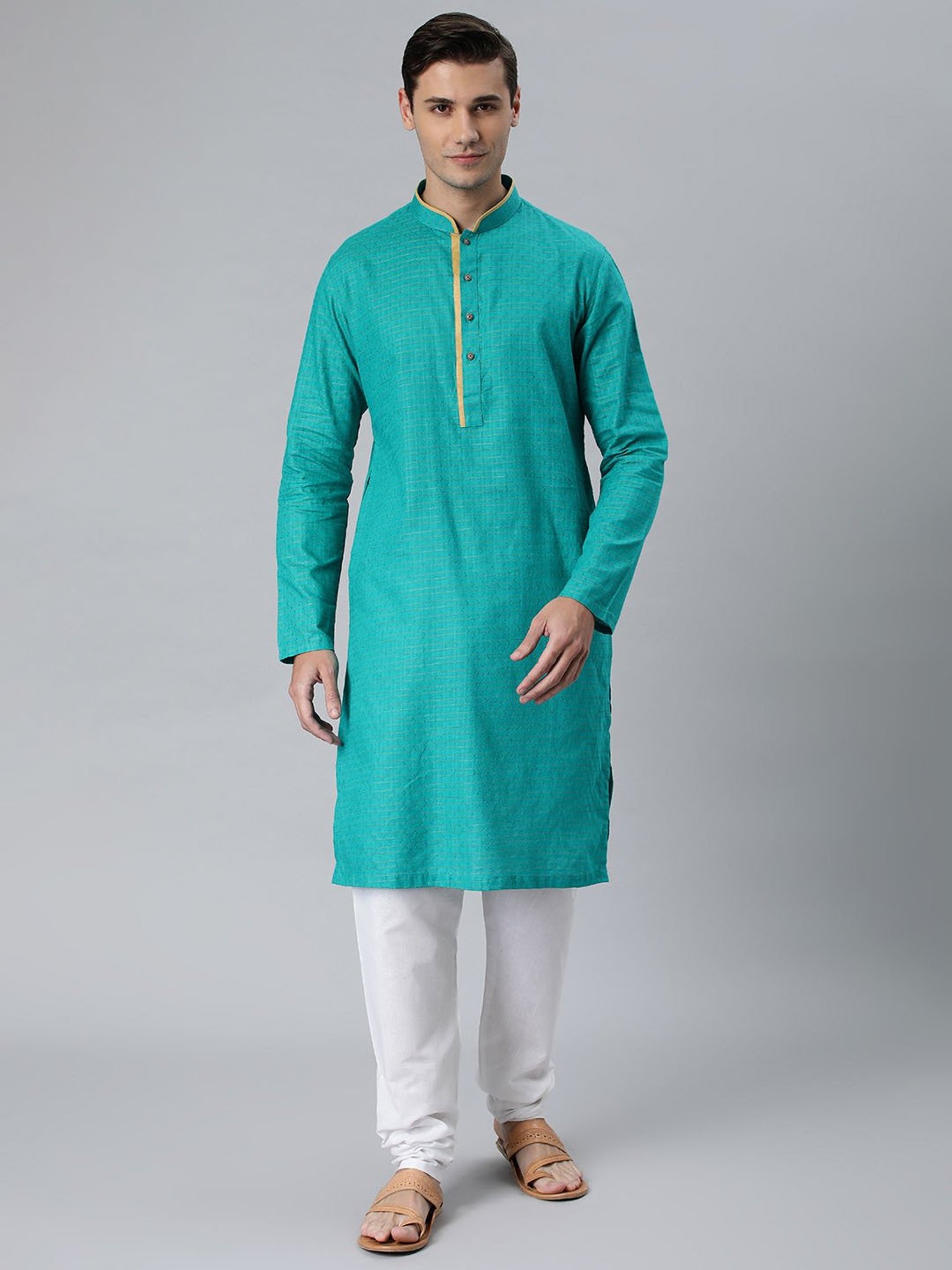 Simple yet stylish, this ethnic turquoise kurta from the house of Manthan is an absolute must-have piece of traditional wear, as you can slip into it for ethnic wear occasion. You will be comfortable in this kurta, for it is crafted from fine and breathable high quality material and features a mandarin collar and full sleeves. The lovely printed pattern of this kurta combined with its turquoise color accentuates your sense of style. To enhance your ethnic avatar, wear this kurta with pyjamas and neutral color Kolhapuri chappals.