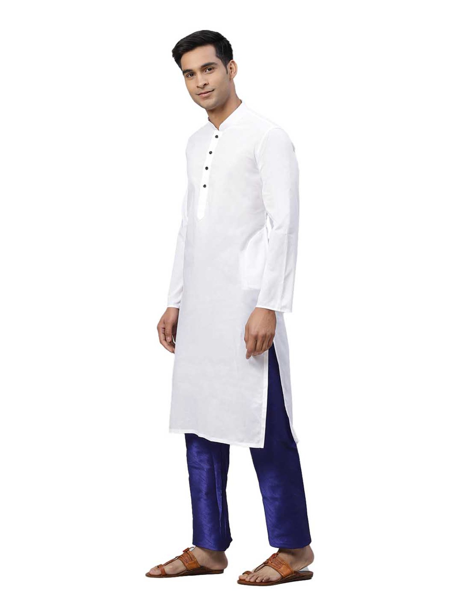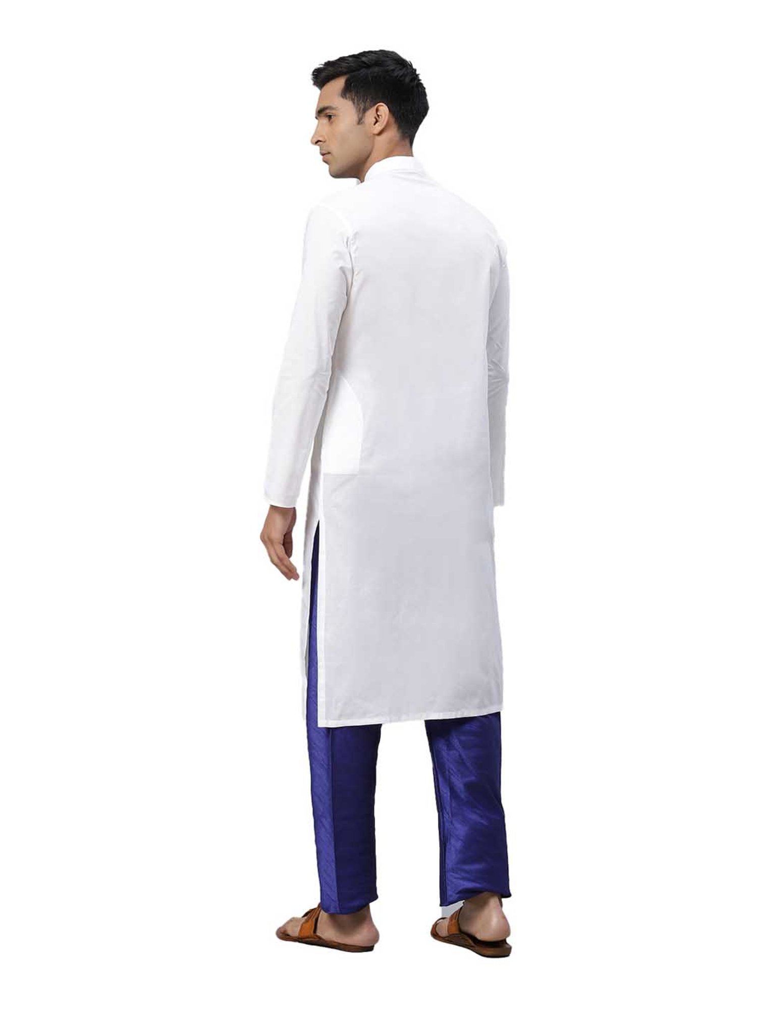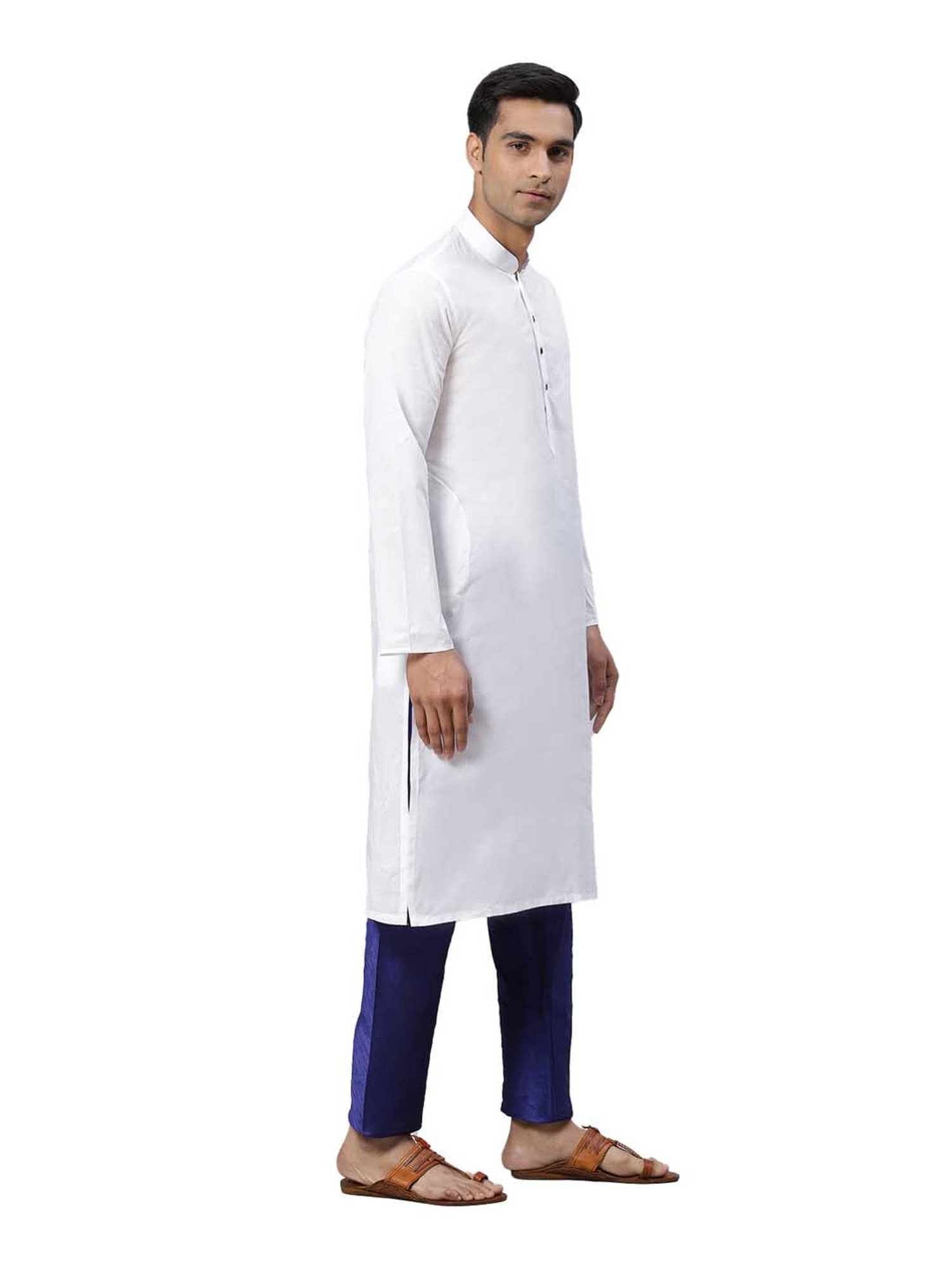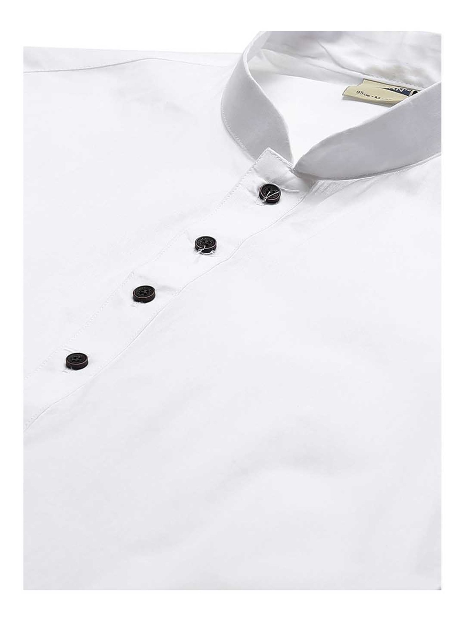 Create a unique style statement when you don this white kurta from Manthan. Made from a cotton blend fabric in a regular fit, this solid kurta features a mandarin collar and full sleeves. Team this kurta with ethnic bottoms.