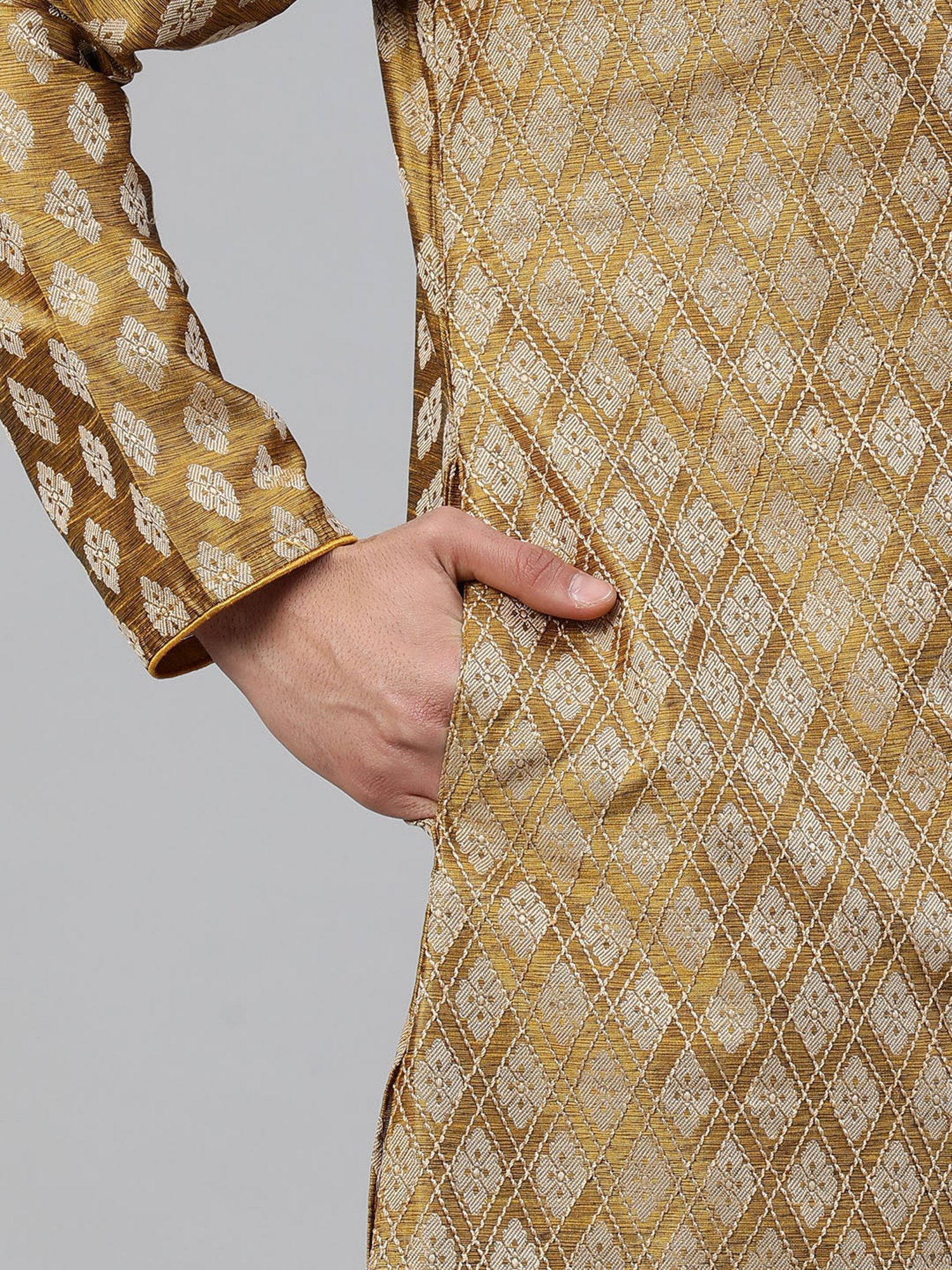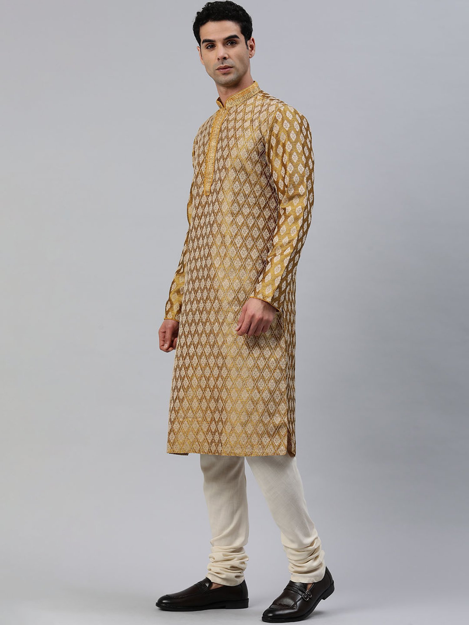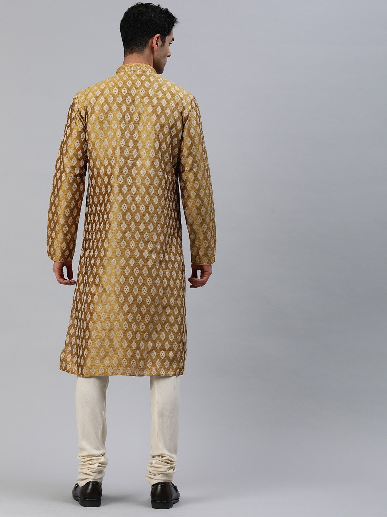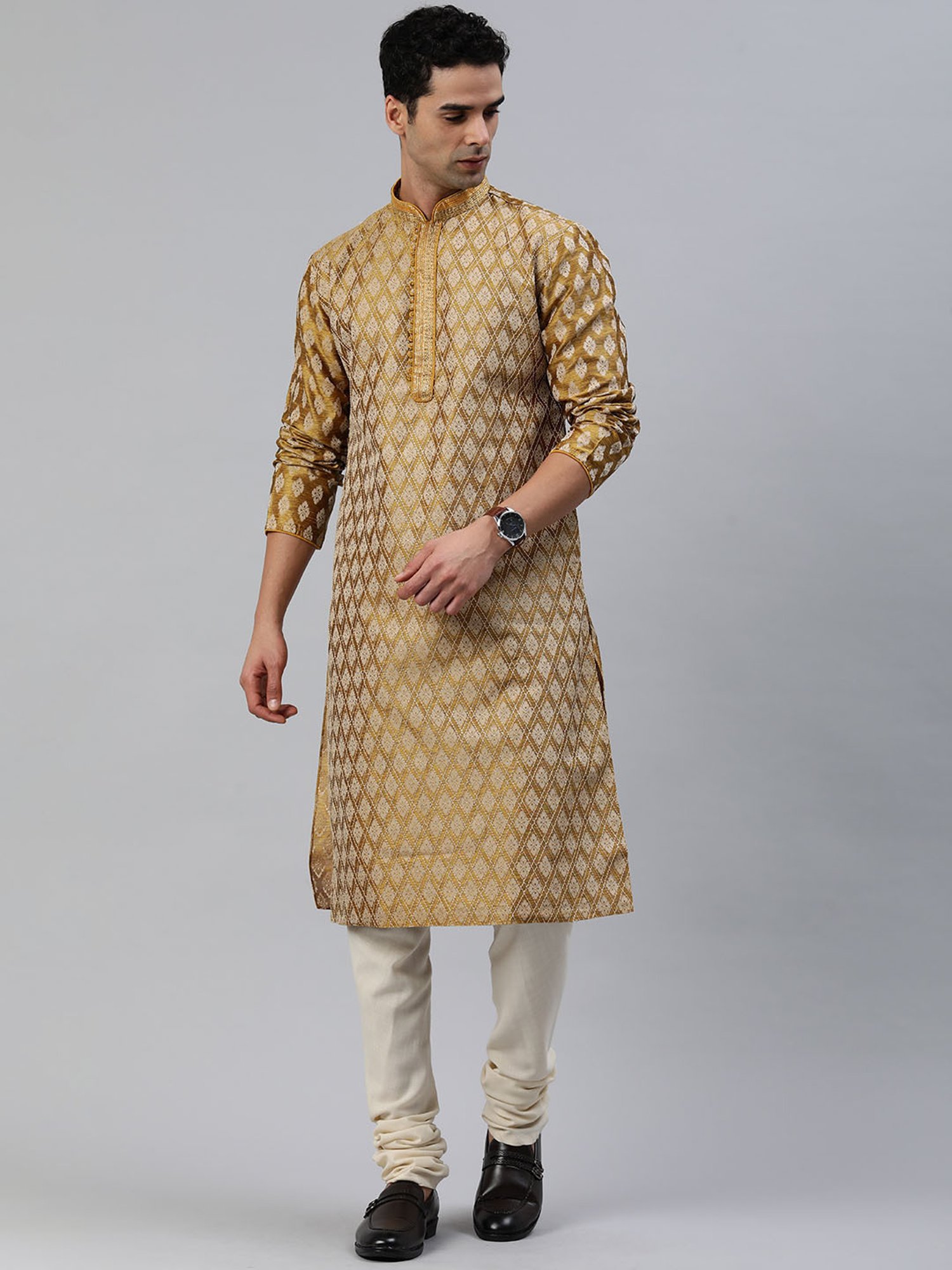 Give your ethnic-wear line-up a cool upgrade with this beautiful yellow mandarin collar kurta from the latest collection of Manthan. Artfully tailored in prime grade cotton blend for gentle softness and subtle sheen replete with a nice drape and excellent comfort, it's classic regular fit cut and versatile self design pattern make it a natural choice for many an evening. Pair it with a contrast Nehru jacket for a stunning ensemble.