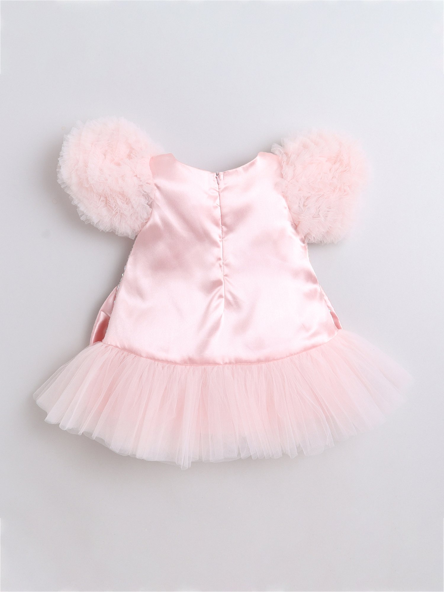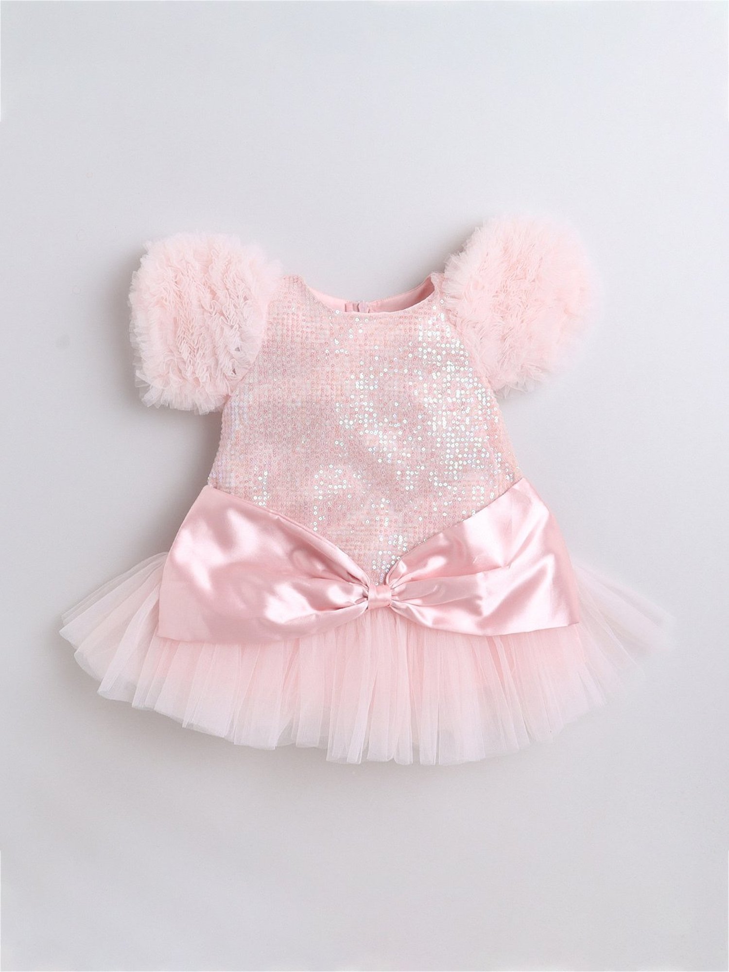 Add this chic pink dress from Many Frocks Kids to your little one's collection to elevate her unique style. She can wear this embellished dress all day long, thanks to its comfortable round neck, short sleeves and net fabric. Team this dress with a pair of sandals to complete the look.
