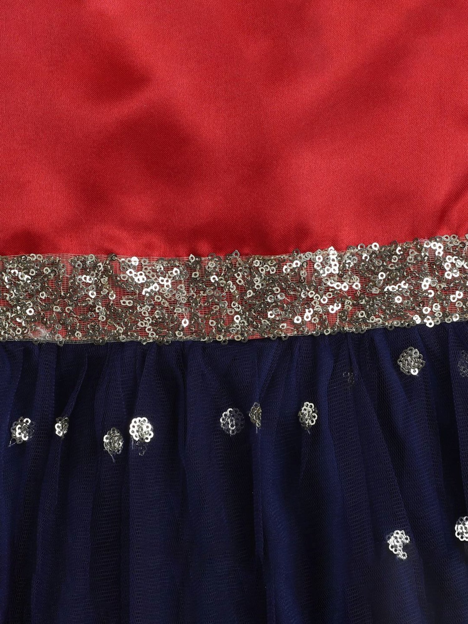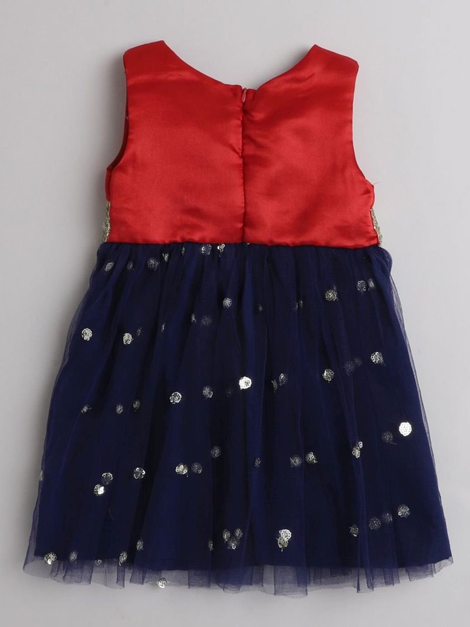 Give your little girl's wardrobe a stylish lift with this red and blue sleeveless dress from Many Frocks Kids. Tailored to sartorial perfection from premium quality fabric, it assures a soft and soothing touch against the skin. The round neck adds to its appeal. The embellished pattern makes it an eccentric choice. Your princess can team it with a pair of sunglasses for a stylish look.
