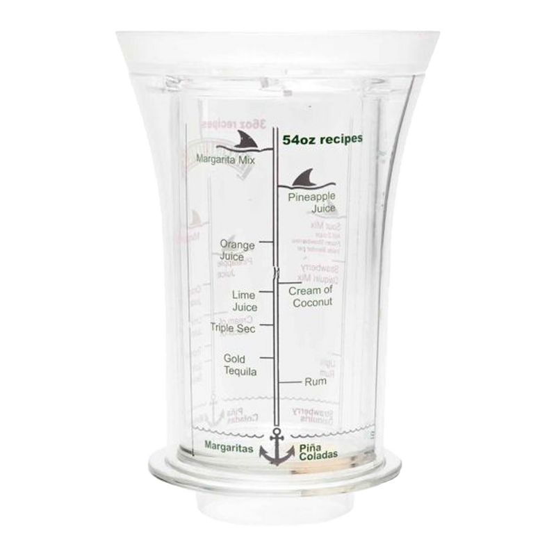 This plastic pitcher fits directly onto the jar opening of your favorite Margaritaville Bahamas, Key West, Fiji, and Explorer frozen concoction makers for versatile use. The drink mixer is ideal for 36-ounce and 54-ounce jars. You'll love to mix margaritas, Pina Coladas, and daiquiris for friends and family with the convenient measurement markings for a tasty drink, every time. Mix your drink ingredients and then use the twist-and-release spout to easily dispense your mix into the blending jar. For simple, stress-free clean up, just pop the container into the dishwasher. This frozen slushie accessory measures 5 inches long, 5 inches wide, and 7.63 inches tall.