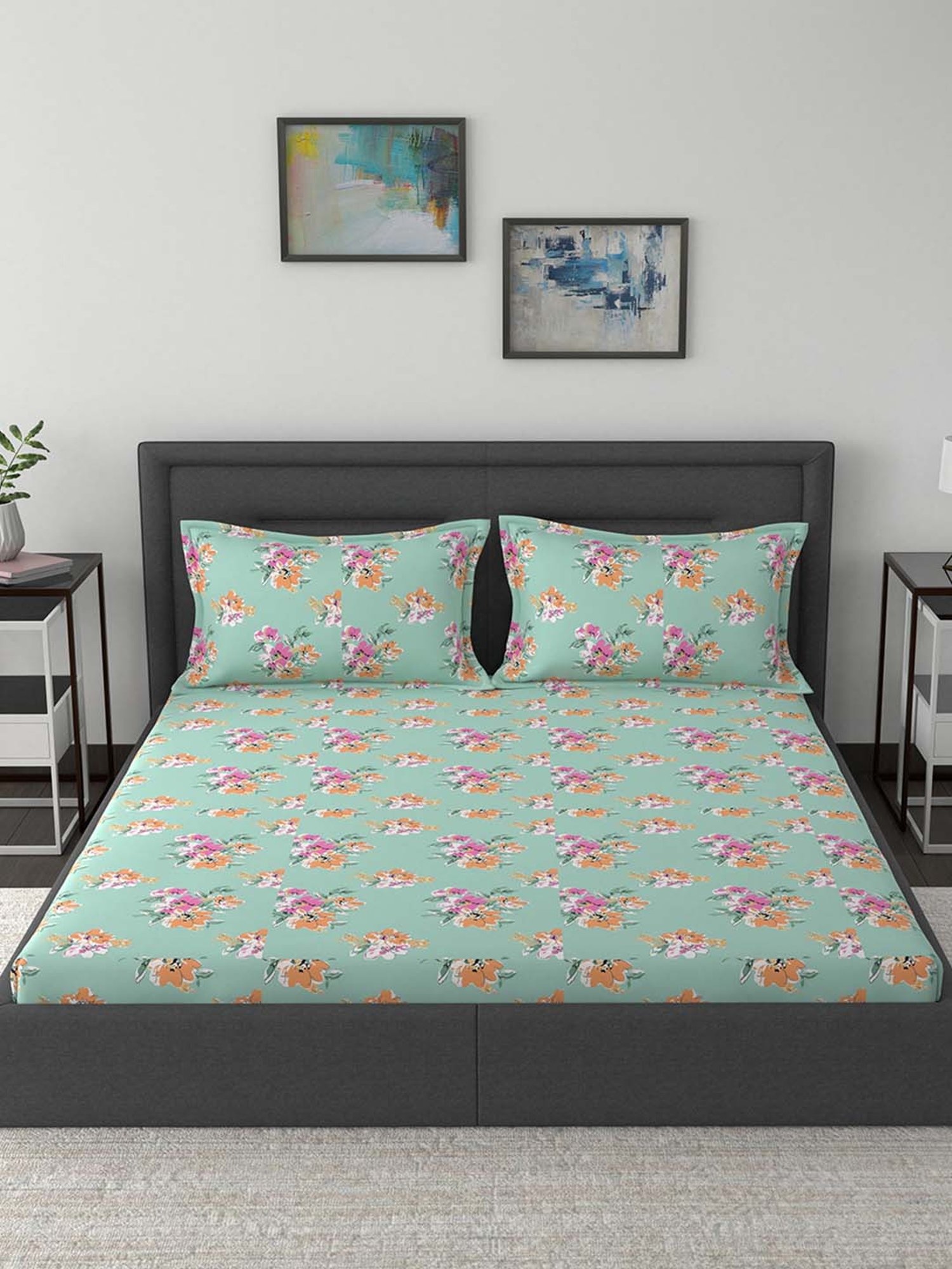 Delve in the surreal grace of this green and orange double size bed sheet set from the Modern Sanctuary collection by Maspar. This set comprises 1 bed sheet and 2 pillow covers. Crafted from 100 percent cotton in sateen weave, this set has a refined finish and flaunts a mesmerizing floral pattern. The thread count of 210 makes this set utterly soft and comfortable.