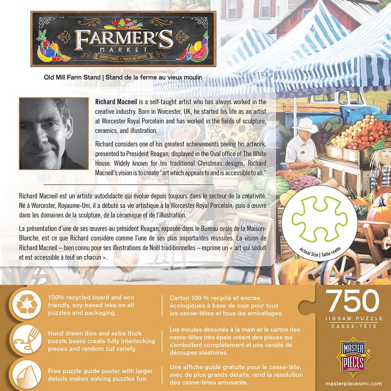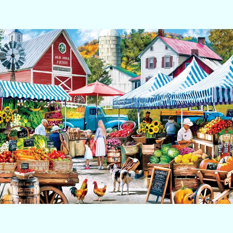 This MasterPieces 18" x 24" 750pc puzzle of the old mill farm opens its farm fresh stand early in the morning. To reduce its impact on our environment, the chipboard used in this puzzle is made of recycled material.