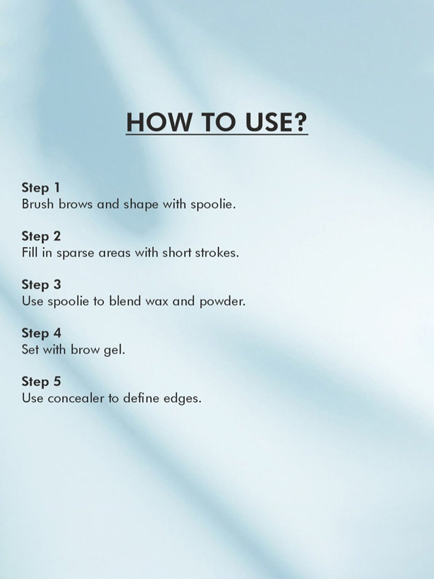 | Usage Instructions | Step 1 - Brush brows and shape with spoolie. Step 2 - Fill in sparse areas with short strokes. Step 3 - Use spoolie to blend wax and powder. Step 4 - Set with brow gel. Step 5 - Use concealer to define edges. |