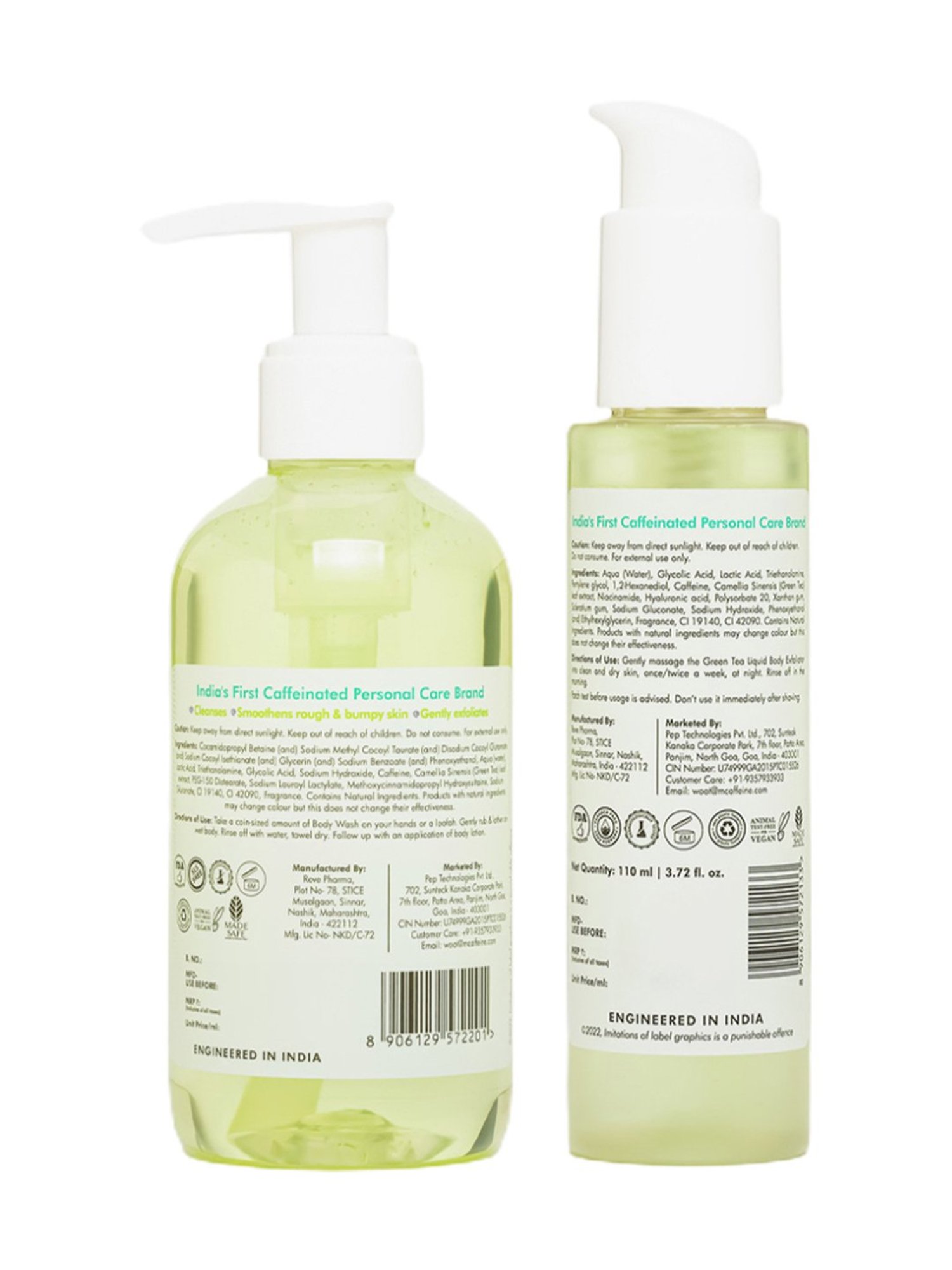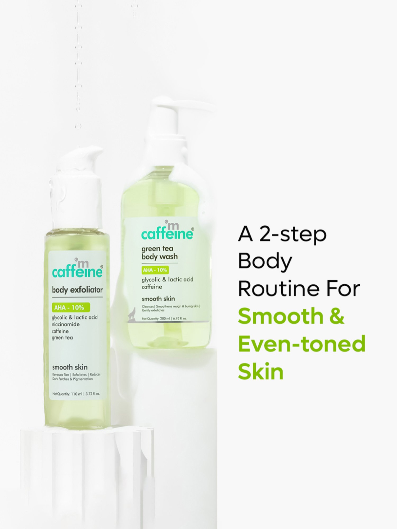 Rough and bumpy skin, pigmentation, dark patches, and tan are common concerns that individuals want to get rid of, without being harsh on the skin. This AHA-infused Green Tea body routine kit is your go-to solution that exfoliates, smoothes rough and bumpy skin, removes tan, and reduces dark patches and pigmentation. Green Tea and 10 percent AHA Body Exfoliator buffs the skin's surface overnight to reduce dark patches and pigmentation, and de-tan, over time. This kit contains mCaffeine Body Exfoliator With AHA- 10% & Green Tea - 110 ml, mCaffeine Green Tea Body Wash With AHA -10% - 200 ml.