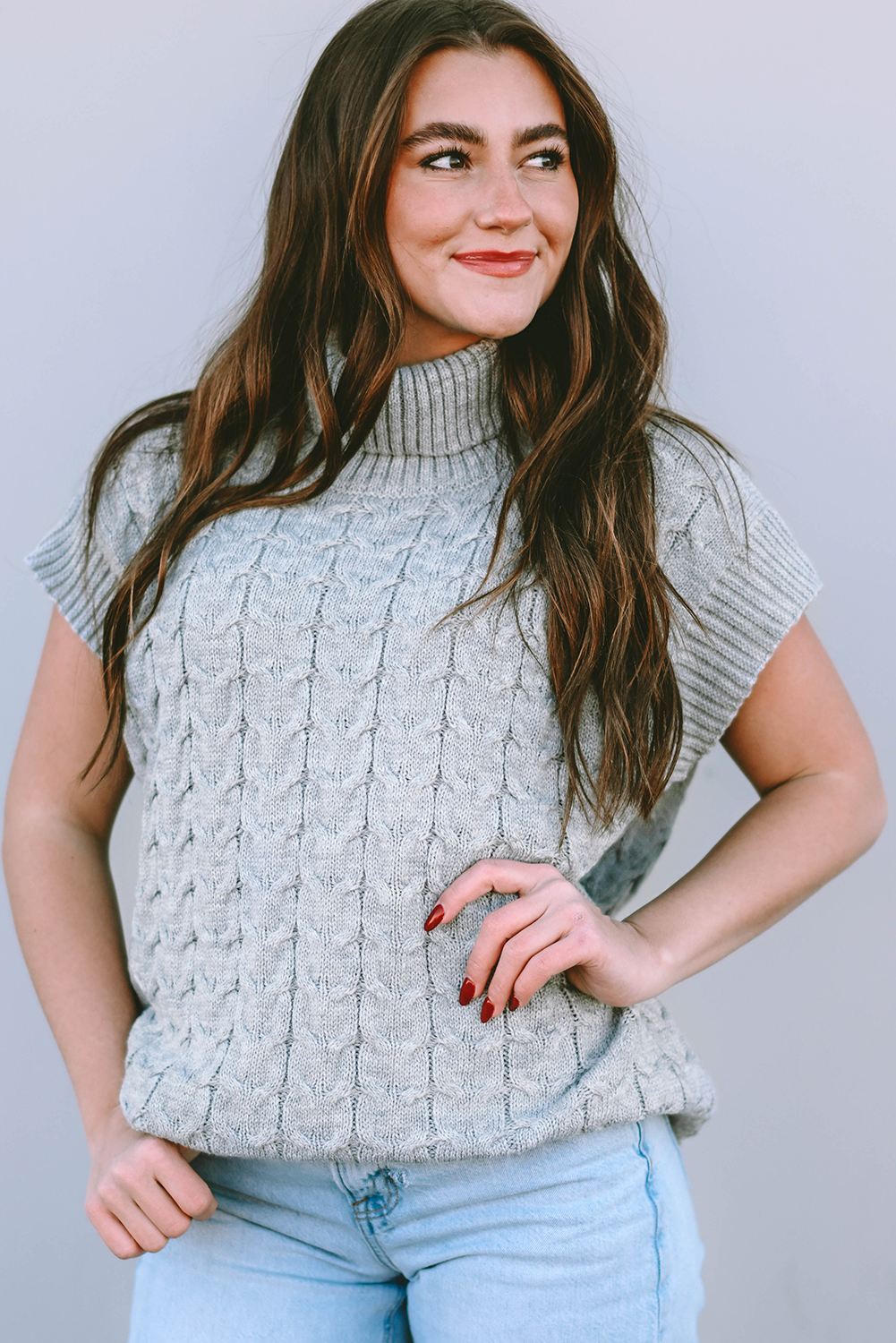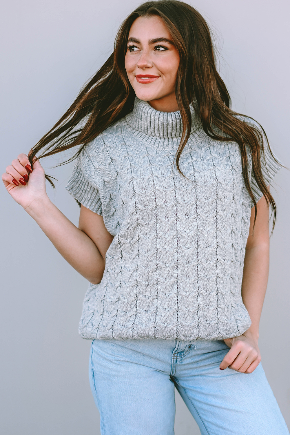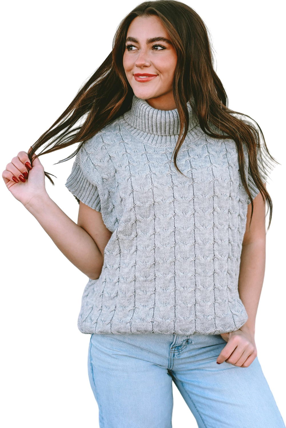 Medium Grey Cable Knit Turtleneck Short Dolman Sleeve Sweater