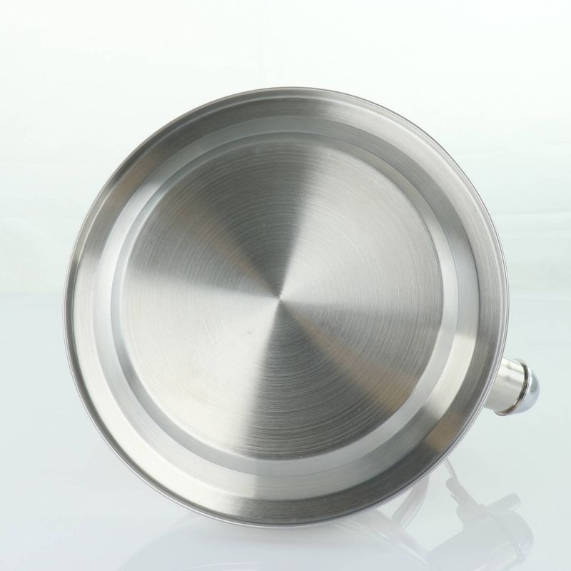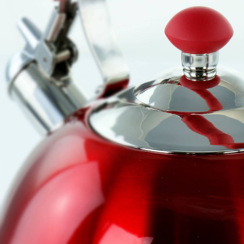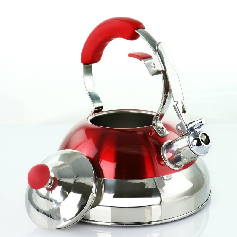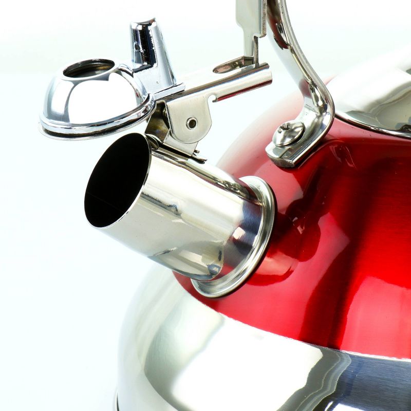 Crafted with style and elegance, the MegaChef 2.7 Liter Stovetop Kettle with beautiful polished design in Red is efficient in even heat transfer for faster boiling. Whistling tea kettle heats up 2.7 Liters of water at a time, ideal for large gatherings.