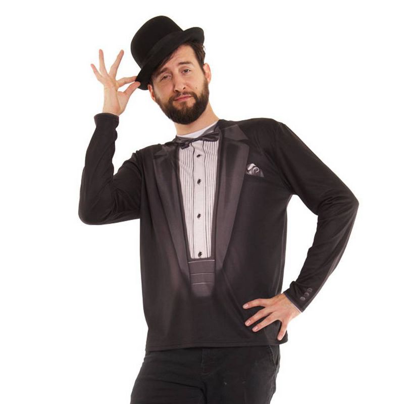 Looking your best has never been easier, by simply slipping into a t-shirt, you'll be ready for the fanciest of events. The Men's Black Tuxedo Costume Shirt is the easy solution for Halloween or any other event. This simple shirt gives you a complete and cool look without a lot of effort and with all-night comfort.