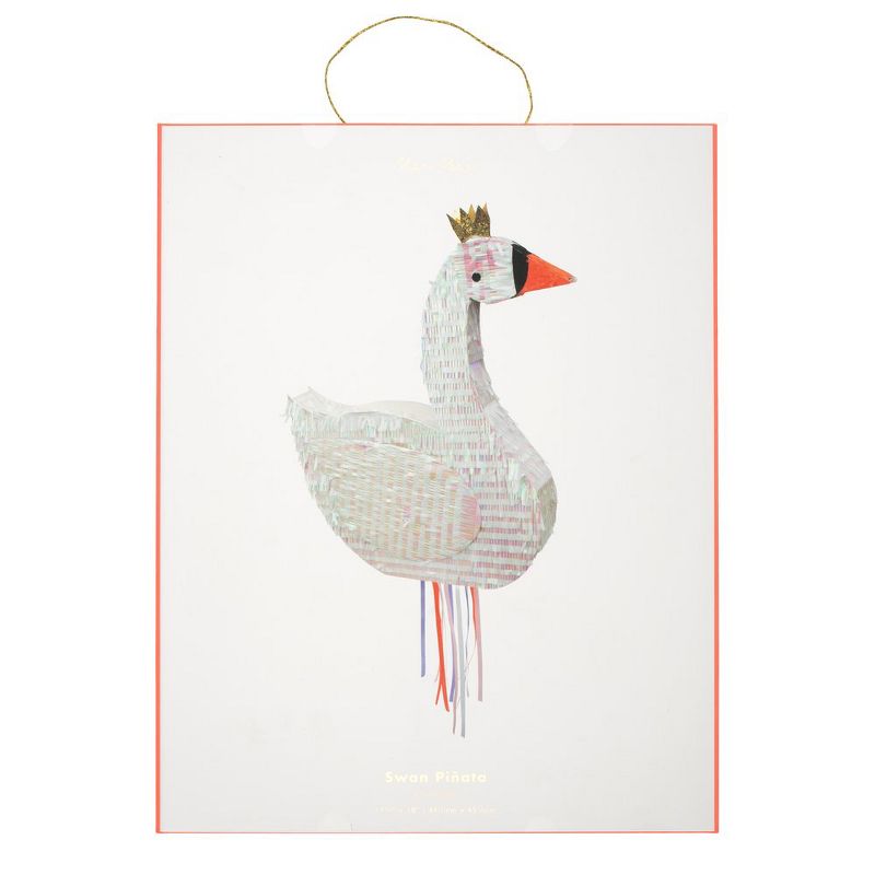 This pretty swan pinata, featuring a shiny gold crown and bright ribbons, is a special decoration and game in one!