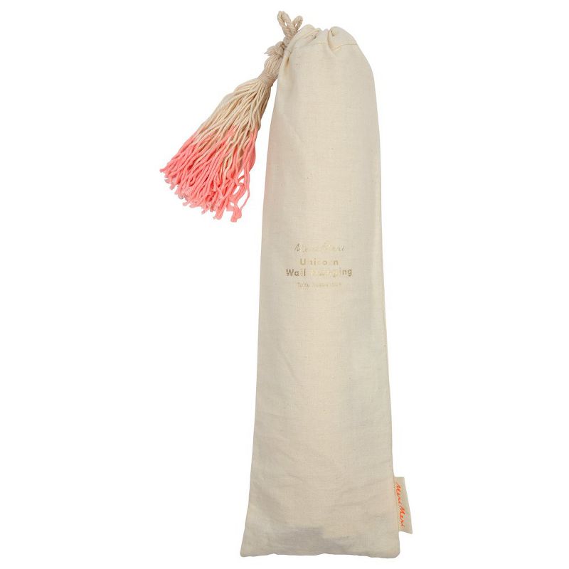 Add a touch of wonder to any little one's bedroom with this beautiful unicorn wall hanging. Made from cotton canvas with a delicately embroidered unicorn, dip-dyed fringed edge, and colorful tassels. It's easy to hang with a wooden pole and cord. Stylishly presented in a drawstring bag.
