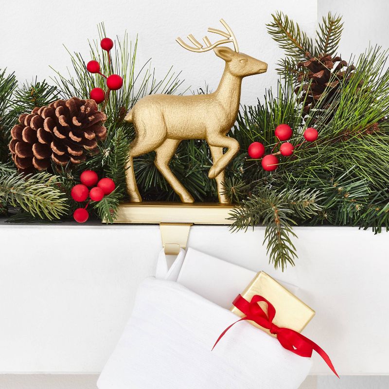 Keep your holiday decor nice and traditional by adding the Metal Deer Stocking Holder with Tapered Hook from Wondershop™. This stocking holder features a gold metal deer resting on a coordinating base for a rustic yet classic look that'll blend in wonderfully with the rest of your seasonal decor. The weighted construction helps it to lay sturdily flat on a ledge or mantel, as well as contributing to holding up to three pounds of a filled stocking, and a tapered hook allows for easy hanging of a stocking from its loop.