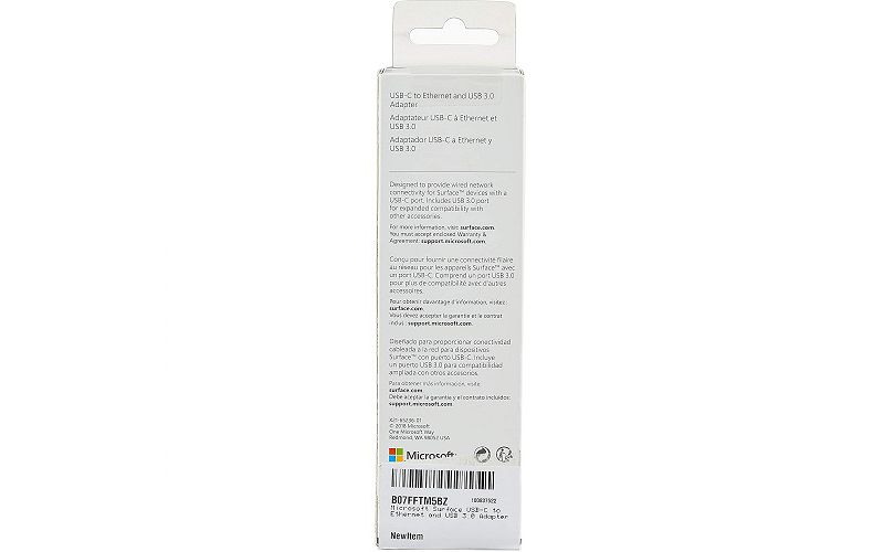 Microsoft Surface USB-C the Ethernet/USB 3.0 Adapter Add standard USB Type-A and Ethernet functionality to your USB Type-C system to connect flash drives, keyboards, networks, and other accessories using the USB Type-C to Ethernet and USB Type-A Adapter from Microsoft. The adapter's male USB Type-C connector connects to your host system, while accessories connect to the adapter's female USB Type-A port and RJ45 cables connect to the female Ethernet port. This adapter conforms to the USB 3.1 Gen 1 standard, which is also known as USB 3.0, and transfers data at speeds up to 5 Gb/s. All connectors are nickel-plated. Features: Compatible with all Surface models with a built-in USB-C port Connect to your network with data transfer rates up to 1 Gbps The indicator light confirms data transfer USB Type-C? and USB-C? are trademarks of USB Implementers Forum
