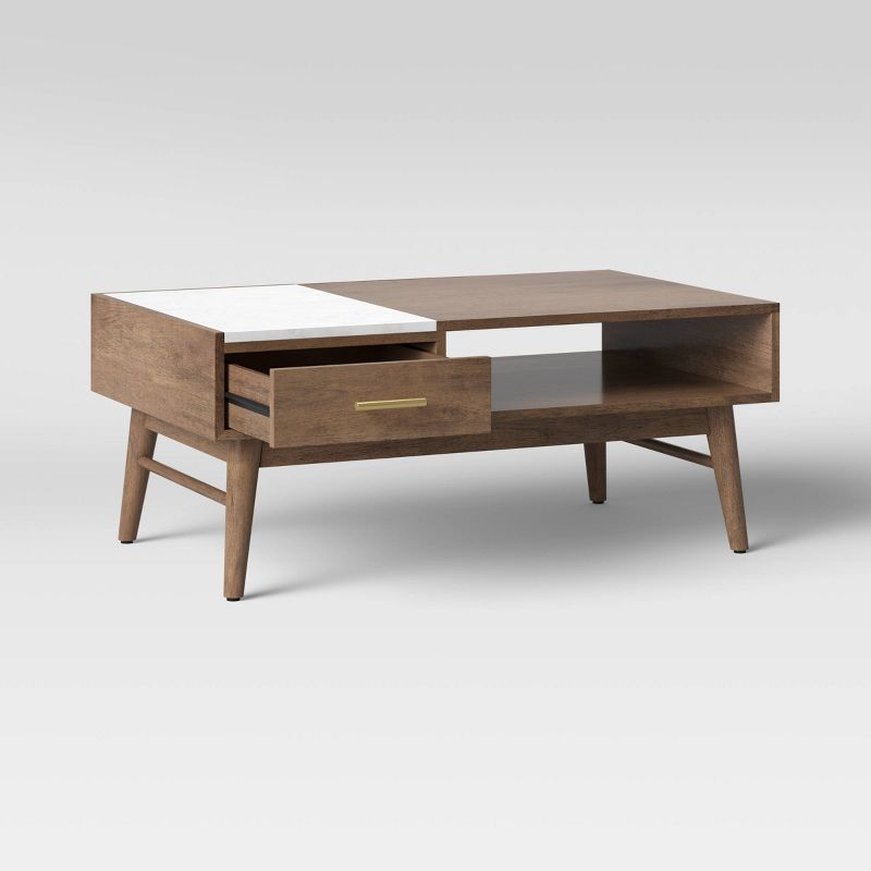 This Mid-Century Wood/Marble Coffee Table from Project 62â„¢ will help you create a perfect setting in your living room. Set atop four tapered legs, this rectangle coffee table comes with a drawer featuring a marble top to offer plenty of space for decorative accents while lending modern style. Plus, an open shelf lends even more surface for books, coasters and more.