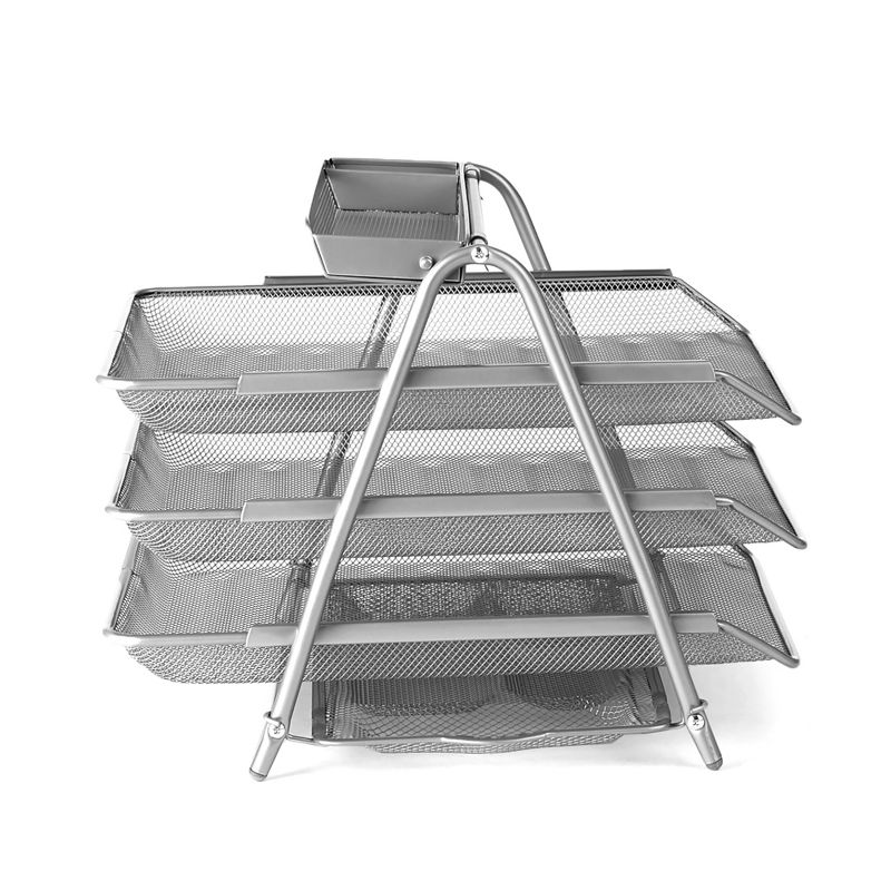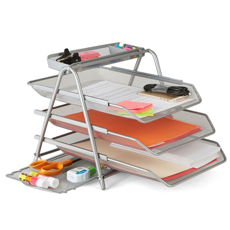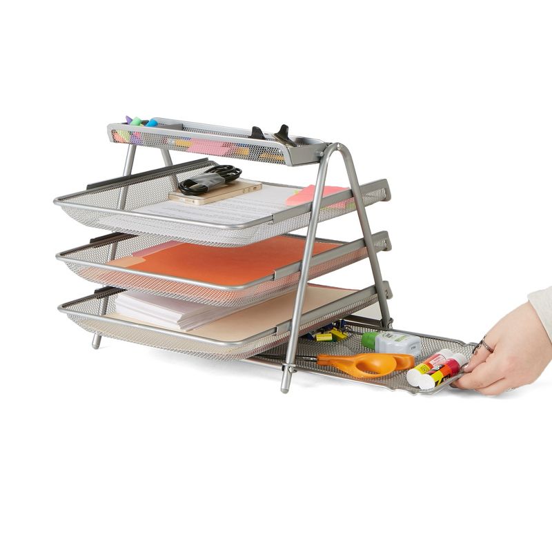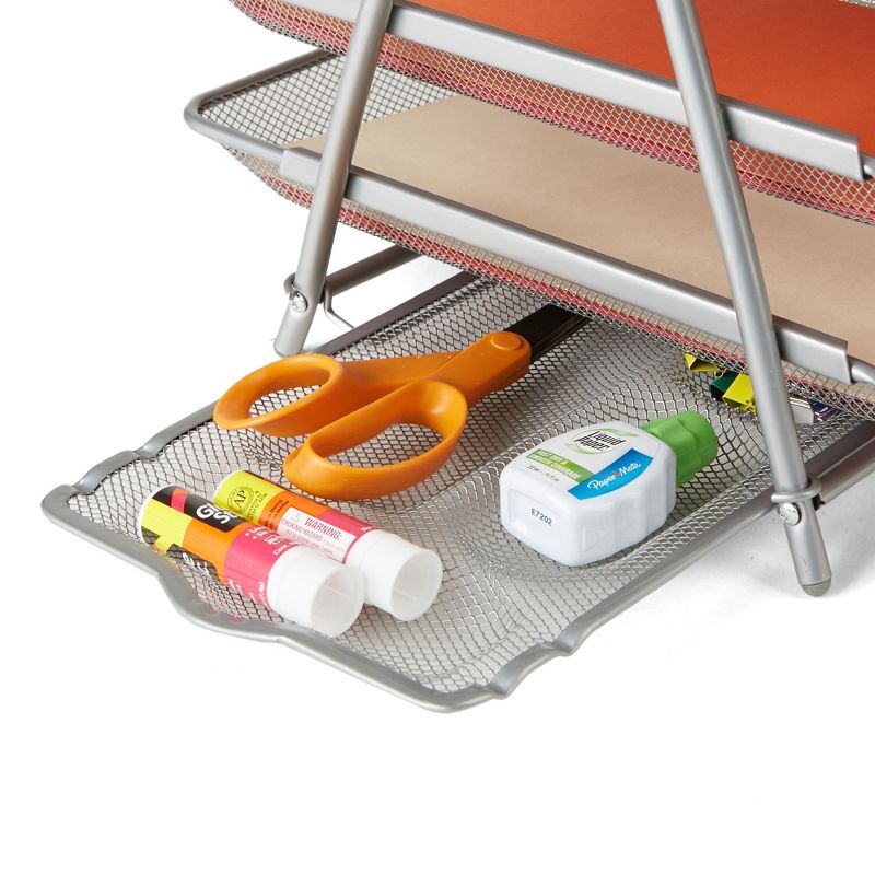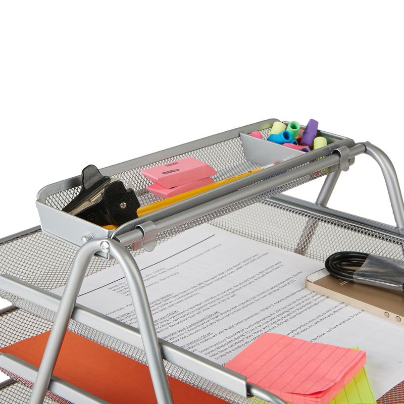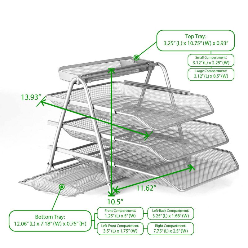 Eliminate clutter from your desktop with a wire mesh desktop letter tray organizer from Mind Reader products.Sort and stash important documents, files, notebooks, mail, textbooks, or even makeup palettes in each section, and slide out each tray individually to find your necessities quickly and with ease. The multi-section design helps to save additional space with a pull-out shelf underneath, and a pen tray at the top for your smaller supplies. These sections provide ample clearance for storing large and small envelopes, file folders, notebooks, and even textbooks, while keeping them at eye level where they're easily located. Purge the excess clutter and unsightly stacks of paper by putting this multi-tier desk organizer to work.This unit measures by, 11.5 L x 13.75 W x 10.5 H, and is made from Wire Mesh