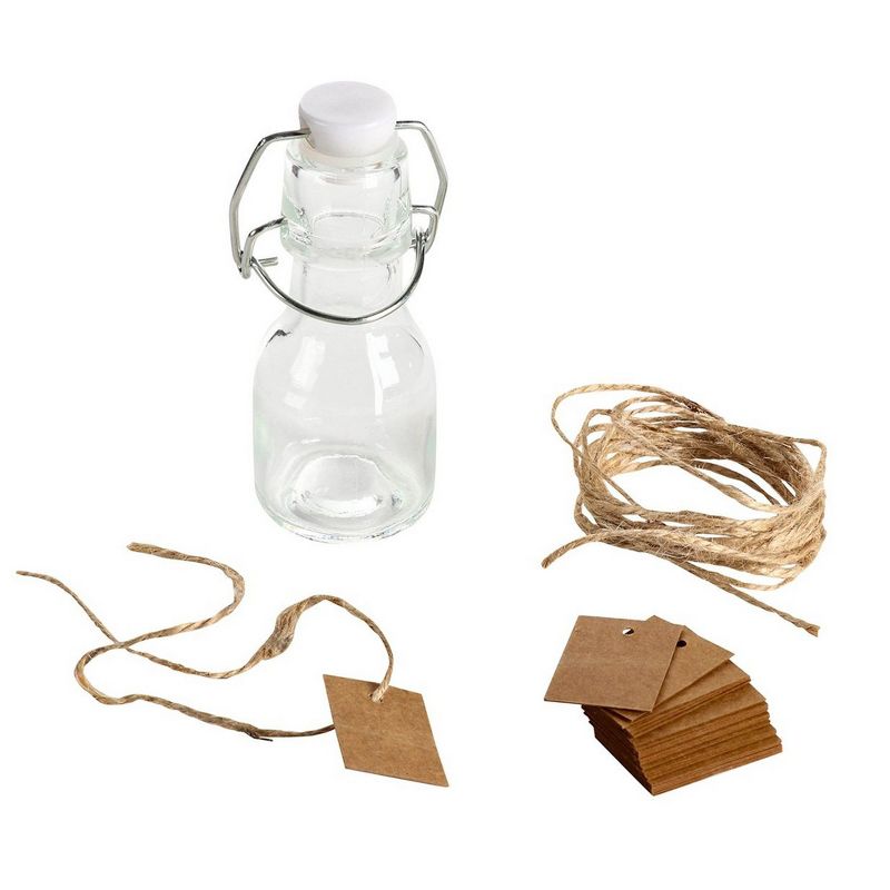 SWING TOP BOTTLES: The package comes with 15 decorative transparent glass bottles. Each bottle has a swing top for closure. This set comes with a jute rope and 25 mini kraft paper tags.