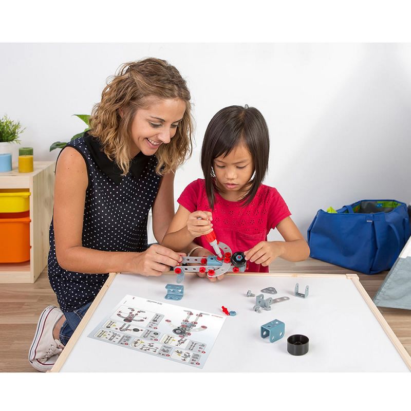 Help your child become the ultimate robot engineer with these stem-focused robot projects! Create mechanical structures of varying complexity that challenge the builder. Provided with multiple pieces including platelets, pins, shafts, screws, nuts, and various wheel sizes, the possibilities are endless. Ideal for hands-on STEM and engineering exploration. Includes 106 pieces and 6 model guides.