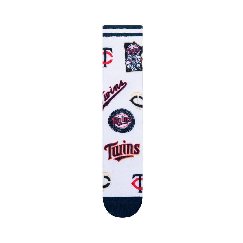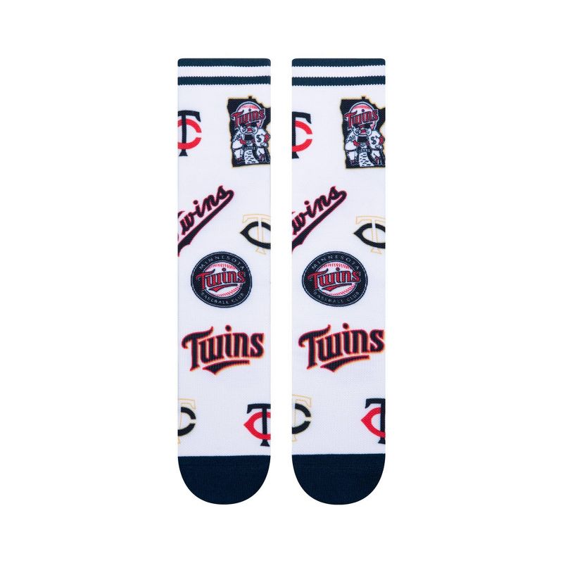 The Minnesota Twins Mixed Up Crew officially Licensed MLB Team Logo Socks are the ultimate fan accessory. Athletic Knit for a classic look, with cartneared arch support and reinforced cushioning in the heel and toe. Printed via Pkwy’s proprietary “360Print” Direct-To-Garment printing process, your design will not stretch and does not show seams in the seamless print. Made from SweatTECH blended yarns, you'll feel cool and more comfortable in all weather conditions. DualKNIT construction improves durability, giving you years of supporting your favorite team. Size L - IdealFIT sizing for men's shoe sizes 6-12.