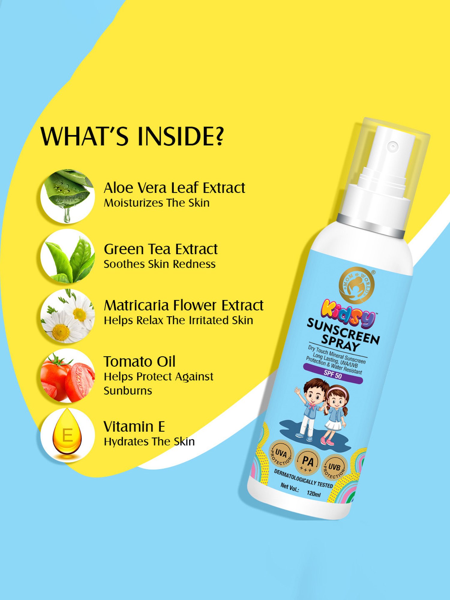 Composition: Purified Water, Octyl Methoxycinnamate (Sunscreen agent), Octocrylene, Benzophenone-3, Caprylic/Capric Triglyceride, Cetyl Alcohol, Octyl Salicylate, Butyl Methoxydibenzoyl Methane, Glyceryl Monostearate (Naturally derived), Vegetable Glycerin, Titanium Dioxide (Sunscreen agent), Fragrance, Polysorbate 20, Zinc Oxide (Sunscreen Agent), Chlorphenesin, Xathan Gum, Silica, Allantoin, Aloe Vera ( Aloe barbadensis) Leaf Extract, Gotu Kola (Centella asiatica) Extract, Grapeseed (Vitis vinifera) Cold Pressed Oil, Green Tea (Camellia sinensis) Extract, Haritaki (Terminalia chebula) Extract, Matricaria (Chamomilla recutita) Flower Extract, Sodium Gluconate, Tomato (Solanum lycopersicum) Oil, Vitamin E Acetate, Watermelon (Citrullus lanatus) Fruit Extract, Caprylyl Glycol, Citric Acid, Caprylhydroxamic Acid, Sodium Hyaluronate (Hyaluronic acid), Methylchloroisothiazolinone, Methylisothiazolinone