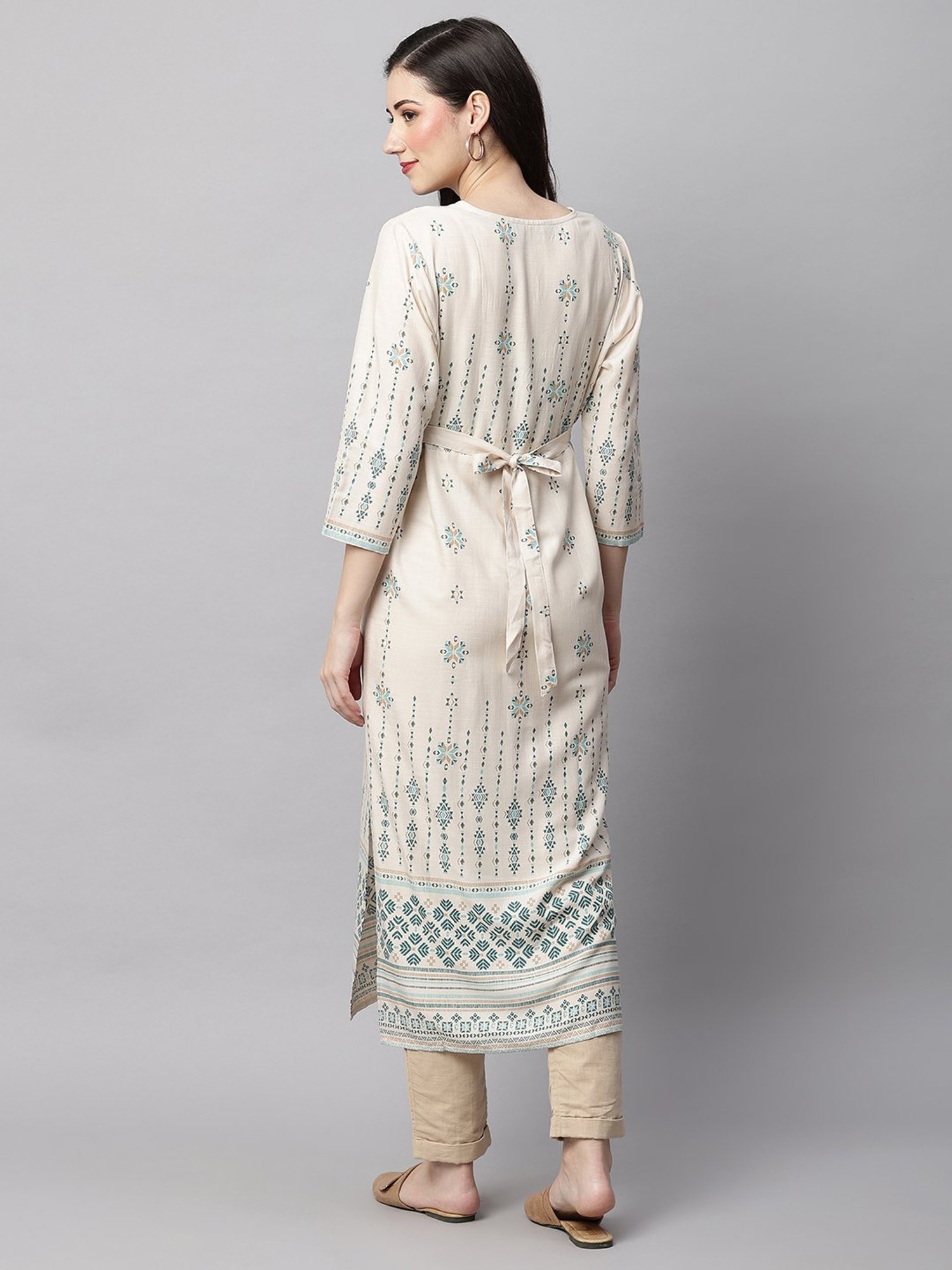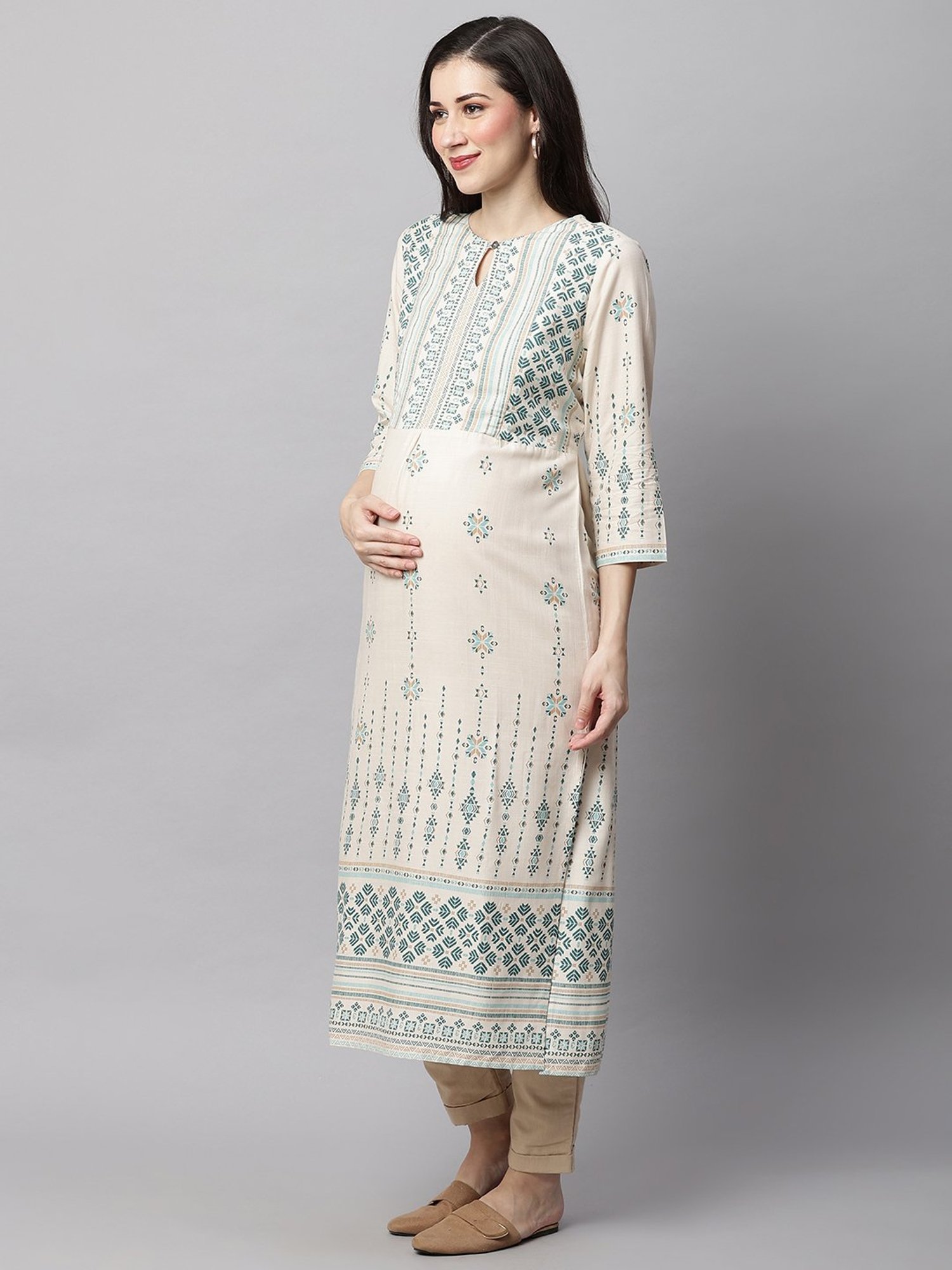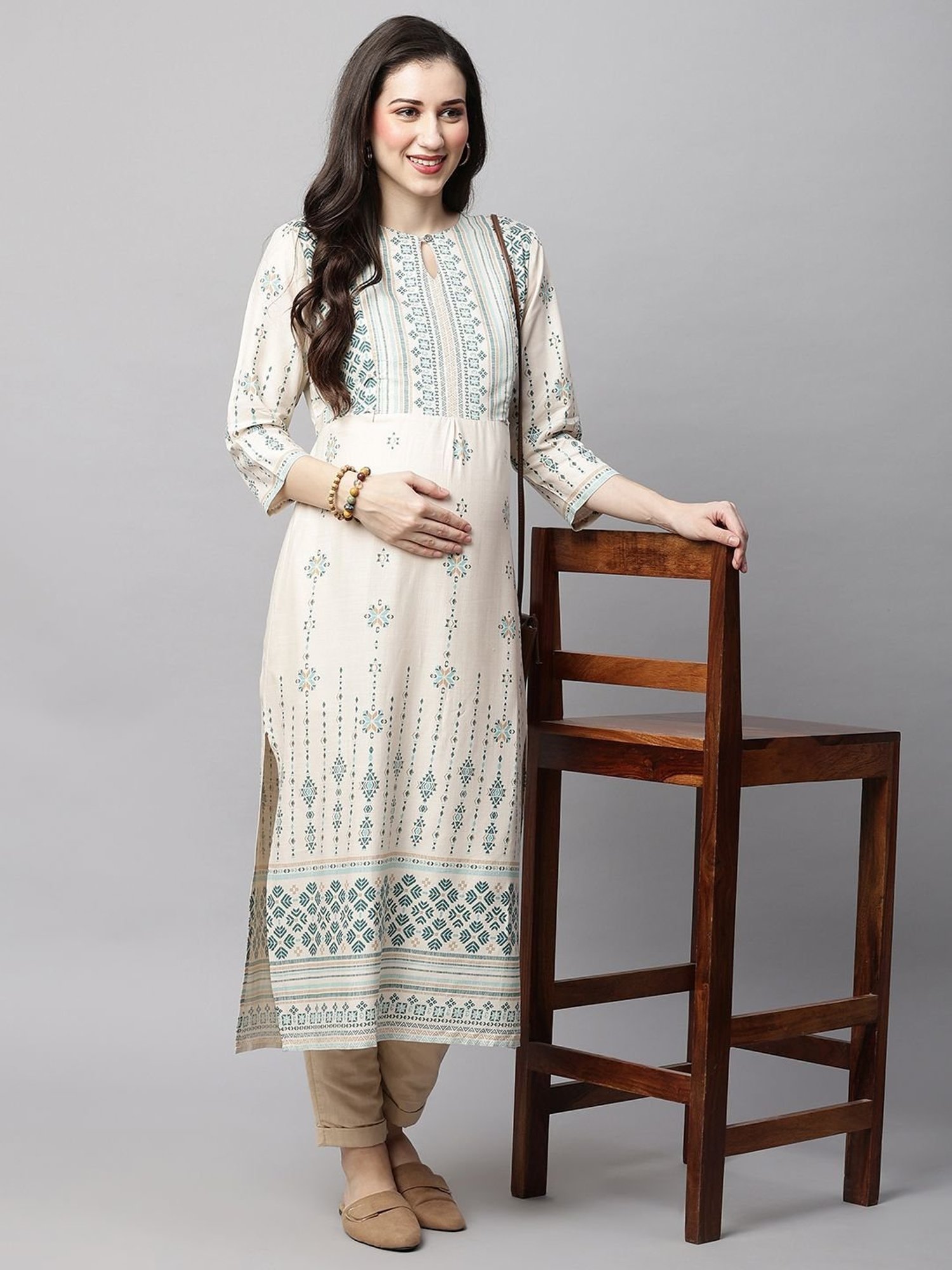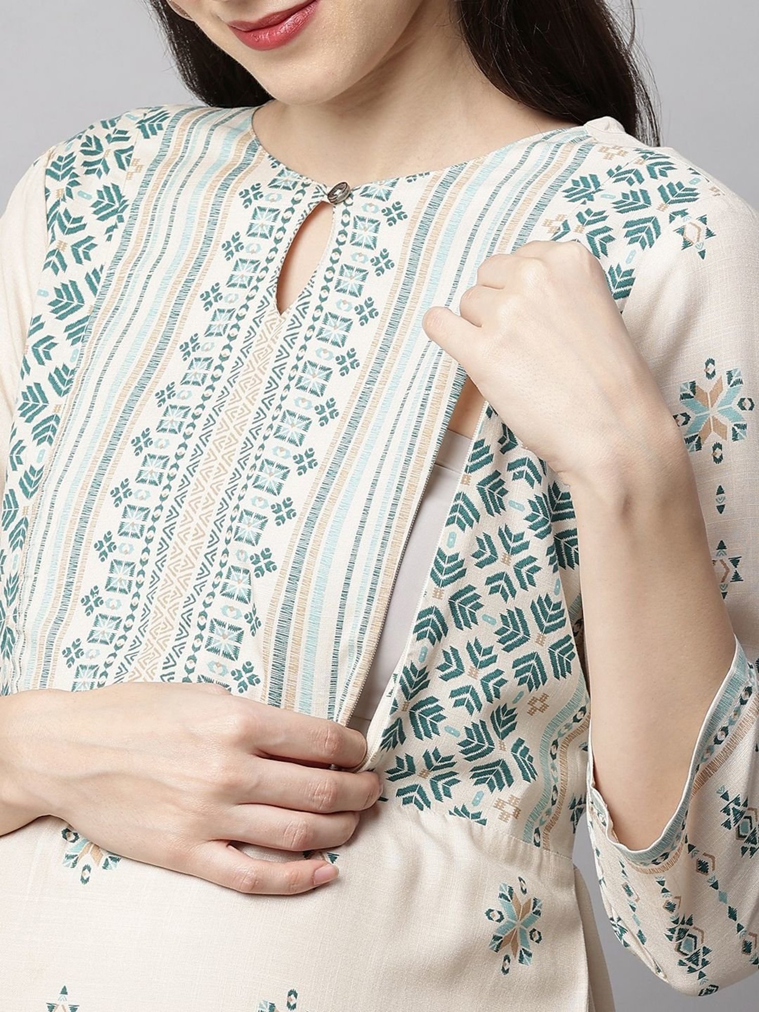 Slay the look of your pre-mom days by wearing this cream maternity kurti from MomToBe. Tailored to sartorial perfection from premium quality fabric, it assures a soft and soothing touch against the skin. The round neck adds to its appeal. Featuring three-fourth sleeves, it will surely impress your peers. The embroidery work speaks for its ornate artistry. It has been designed to provide gentle support and fit throughout your pregnancy as your body changes.