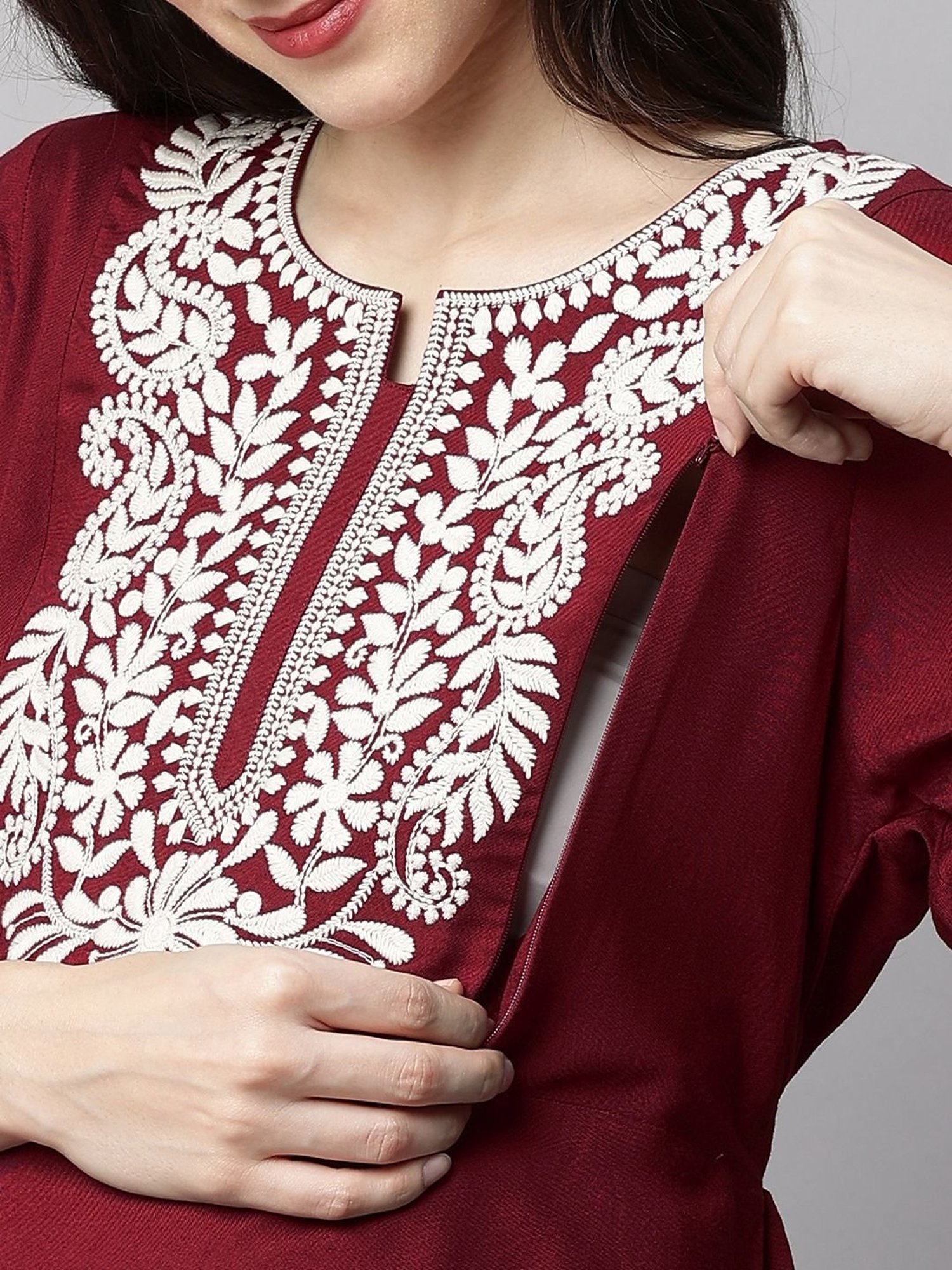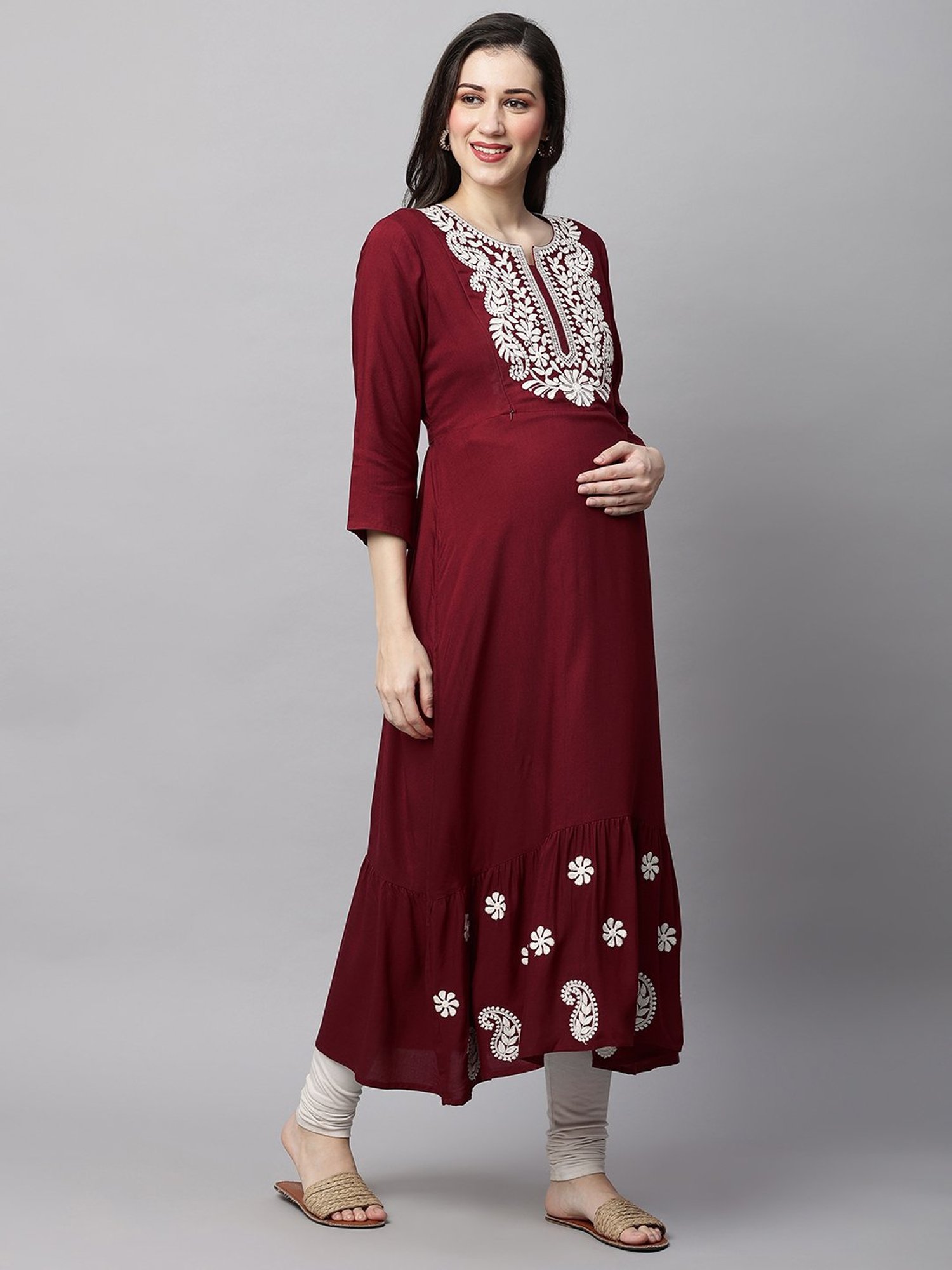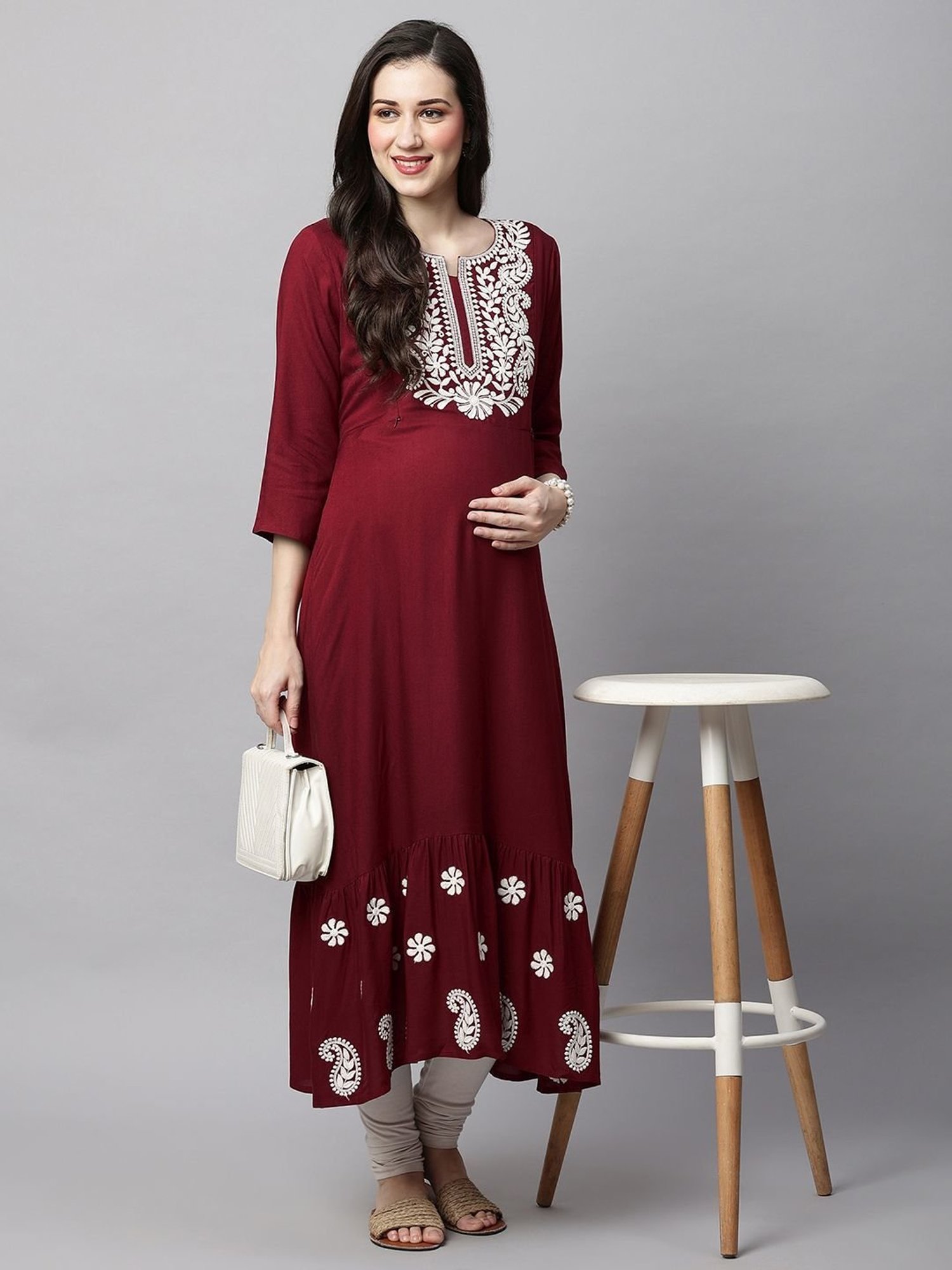 Hit the roads in style even during your maternity days by wearing this maroon maternity kurti from MomToBe. Tailored to sartorial perfection from premium quality fabric, it assures a soft and soothing touch against the skin. The round neck adds to its appeal. Featuring three-fourth sleeves, it will surely impress your peers. The embroidery work speaks for its ornate artistry. It has been designed to provide gentle support and fit throughout your pregnancy as your body changes.