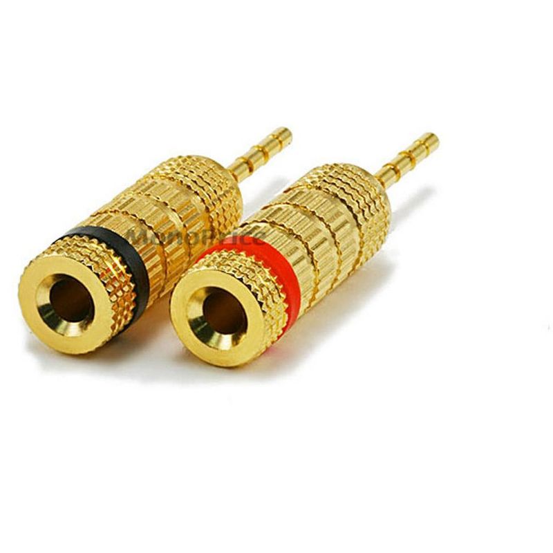 Pin plugs make speaker installation a breeze. They are designed for use with amplifiers or speakers fitted with either traditional binding posts or spring clip connectors. Not only is it easier to make the connection on the back of your amp, it is safer, with no chance of stray wire strands creating a short across contacts. These high quality plugs are the closed screw type and can accept bare wire or spades. They are sized to fit speaker wire from 12 to 18 AWG. Each pair comes with one plug color coded red and the other coded black, for easy polarity identification. The plug body is made of copper fitted with a ferromanganese tip. The entire plug is then plated with gold to help prevent corrosion and ensure smooth connections. Features:* Can accept bare wire and spades* Can accept 12 to 18 AWG speaker wires* Grooved pins prevent slippage* Color coded black/red rings for maintaining proper polarity* Secure, positive contact with binding posts* Corrosion resistant, 24K gold plated finish* Copper body construction and ferromanganese tips* Each order includes ONE pair (2 plugs total)