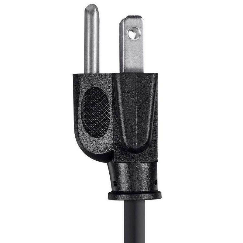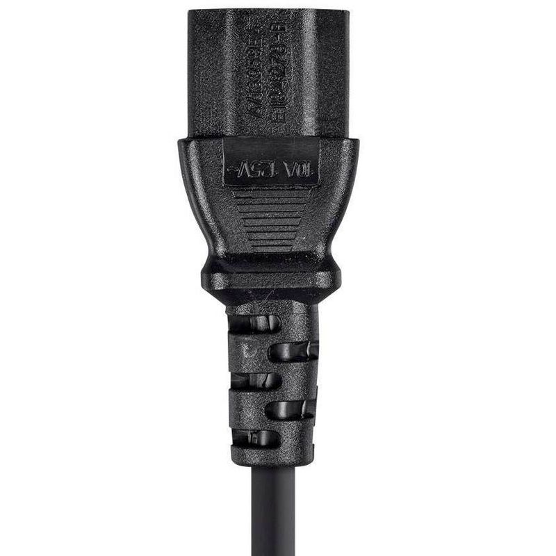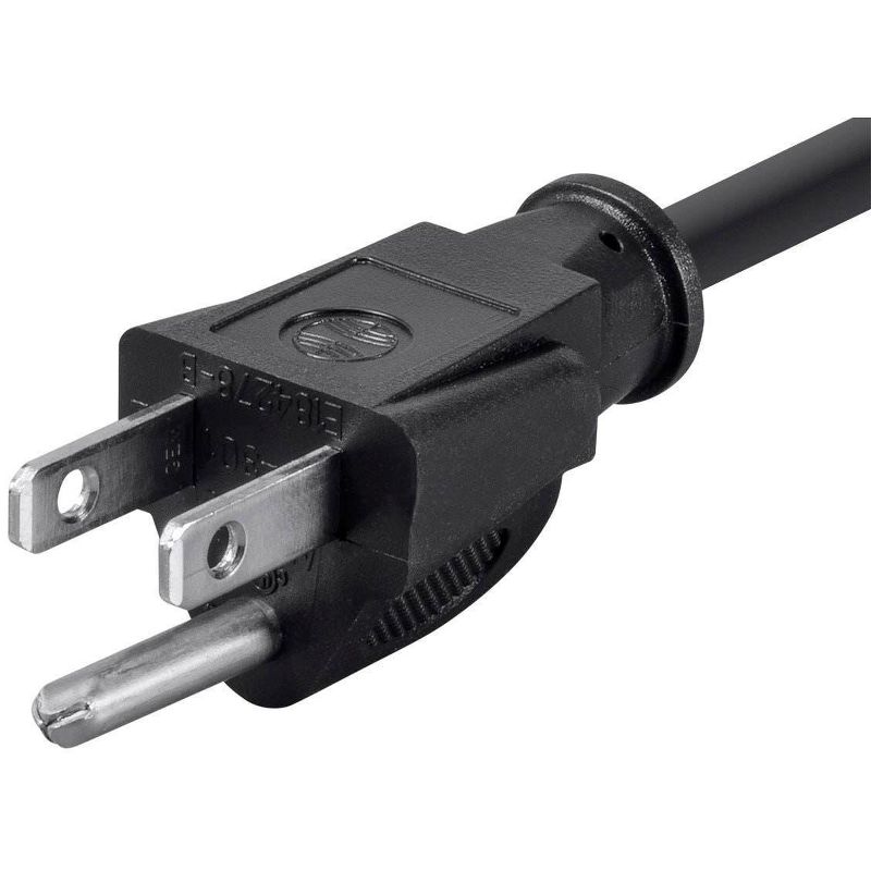 • The power cord features a standard, grounded NEMA 5-15P plug on one end and an IEC 60320 C13 connector on the other end.