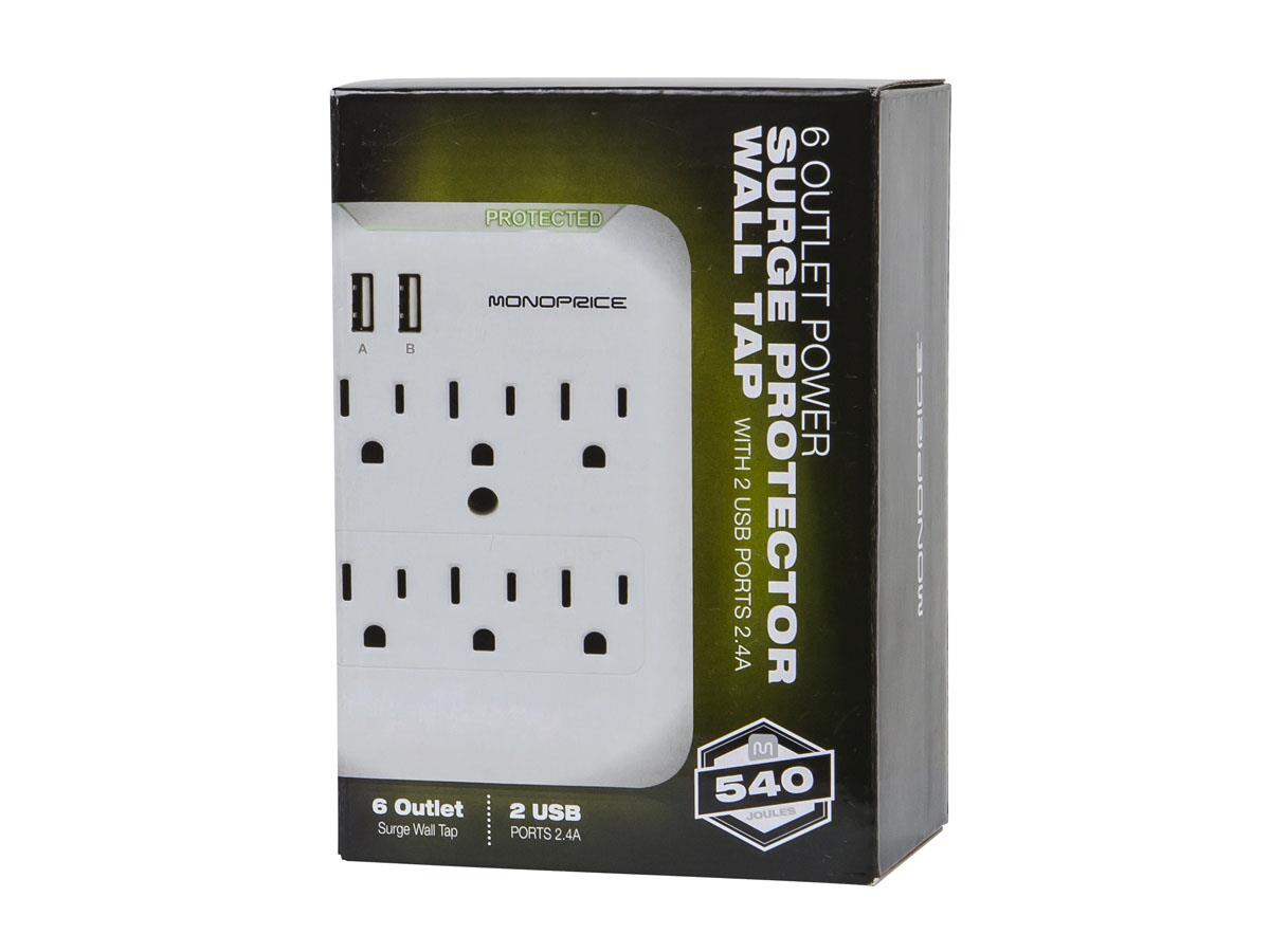 Protect your electronic equipment from damaging voltage and current spikes with this Monoprice surge protector! This model features six protected power outlets and two USB charging ports with a total of 2.4A of charging power. It is rated for 120V, 15A, 1800 watts and provides up to 540 Joules of power protection. It can handle up to 36, 000A current spikes, has a 500V clamping voltage, and provides up to 40DB of EMI/RFI rejection.
