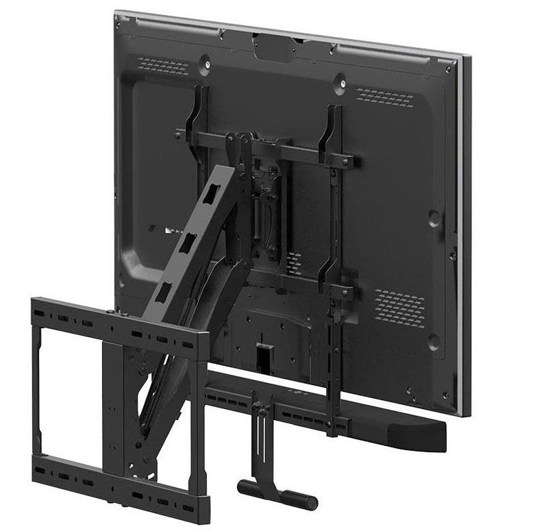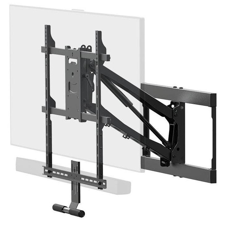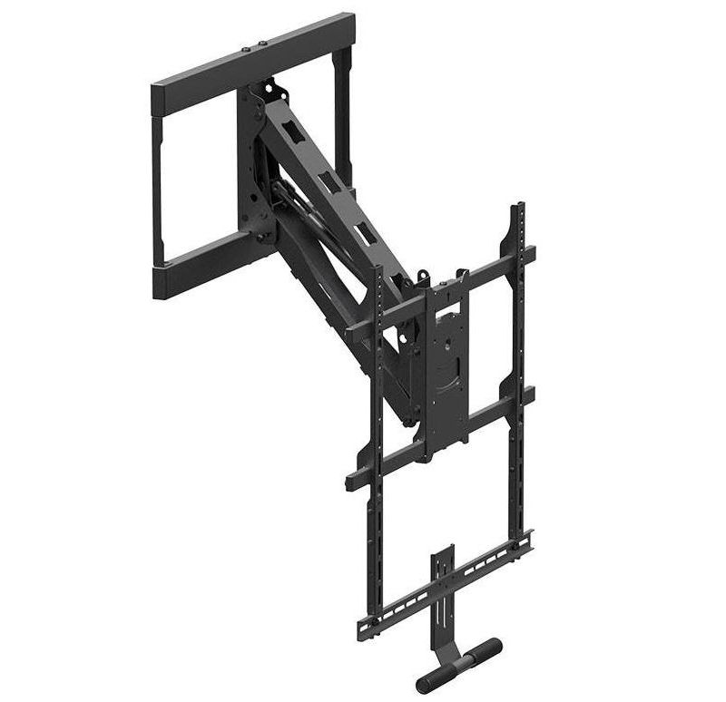 The Monoprice Above Fireplace Mount with Soundbar Bracket conveniently pulls down, lowering your TV to eye-level to reduce the strain from constantly looking up at the television. The included soundbar bracket provides the option to free up mantel space and enhance the sound. This mount is capable of tilting, swiveling, and rotating your TV's position, and supports TVs weighing up to 62 pounds.