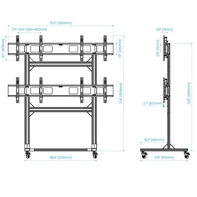• 2 x 2 video wall cart can mount four flat panel displays randing from 32 to 55, weighing up to 100 lbs. (45kg) each.
