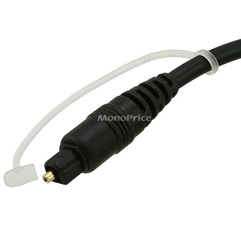 Experience superb sonic clarity and accurate musical reproduction with this Optical Toslink cable from Monoprice!Optical S/PDIF (aka Toslink) cables are an excellent way to distribute high-definition, multi-channel audio without the risk of common electrical problems, such as ground loops or RF and EM interference. This cable features a full-sized Toslink connector on one end and a mini (3.5mm) Toslink connector on the other end, plus molded connector heads and strain-relief boots.Features:* Full-sized male TOSLINK optical audio connectors on one end* Mini male TOSLINK optical audio connectors on one end* 5.0 mm outside diameter* Molded strain relief connectors reduce strain where the cable and connectors meet* Gold plated ferrule resists corrosion and provides maximum protection for the connector tip* Precision polished fiber tips for maximum signal transfer* Plastic tip protectors attached to each end to protect the optical cable when not in use*** ***