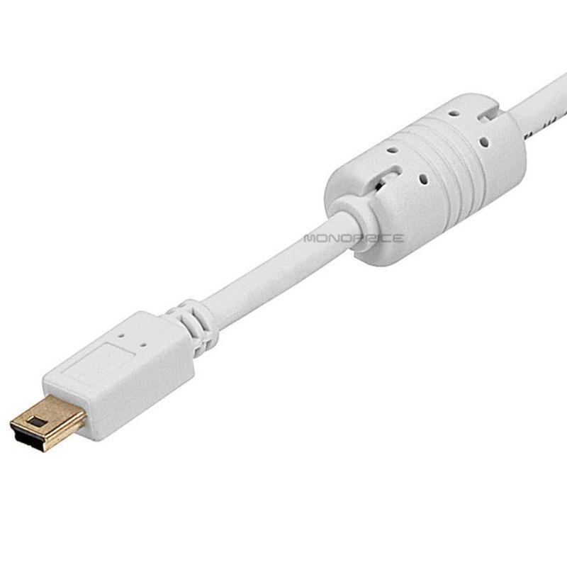 Connect your devices with USB mini B connector using this USB 2.0 A Male to USB Mini-B Male Cable from Monoprice. This cable features a standard USB A male connector on one end and a 5-pin mini B connector on the other. It uses 24awg conductors for the power lines and 28awg conductors for the data lines, for improved current carrying capacity. The cable is shielded using braid and foil shields and it includes a single ferrite core, which helps filter out electromagnetic and radio frequency interference (EMI and RFI). The connectors are gold plated for smooth, corrosion free connections.