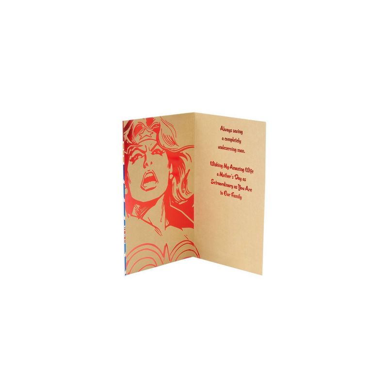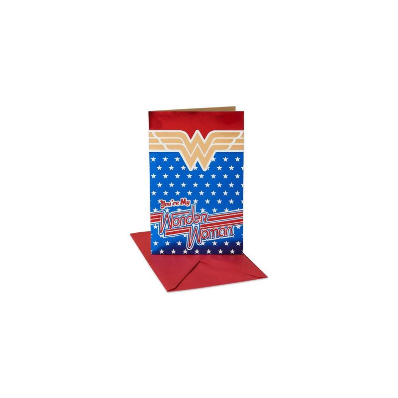 Wish your amazing wife an extraordinary Mother’s Day! This shimmering, all-foil card design features the gold Wonder Woman emblem below a red edge and over a pattern of white stars on blue. A red-foil, silkscreen-style depiction of Wonder Woman appears inside the card with a funny, complimentary message she’ll love. It’s the perfect way to celebrate your own Wonder Woman! American Greetings offers exceptional greeting cards, gift wrap and celebration products so you can connect in ways that fit your personality and authentic style.