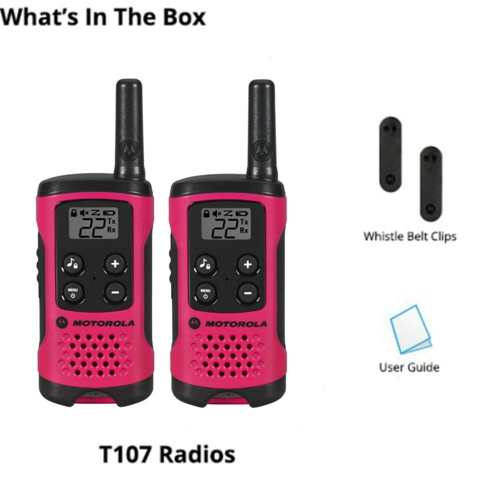 Motorola T107 2-Way Radios. . The Motorola T107 is a 2-Way Talkabout Radio for indoor and outdoor communication. It is Simple, compact and easy-to-use for families specially during shopping, on the beach or just playing in the park, the T107 is the perfect way to stay in touch.