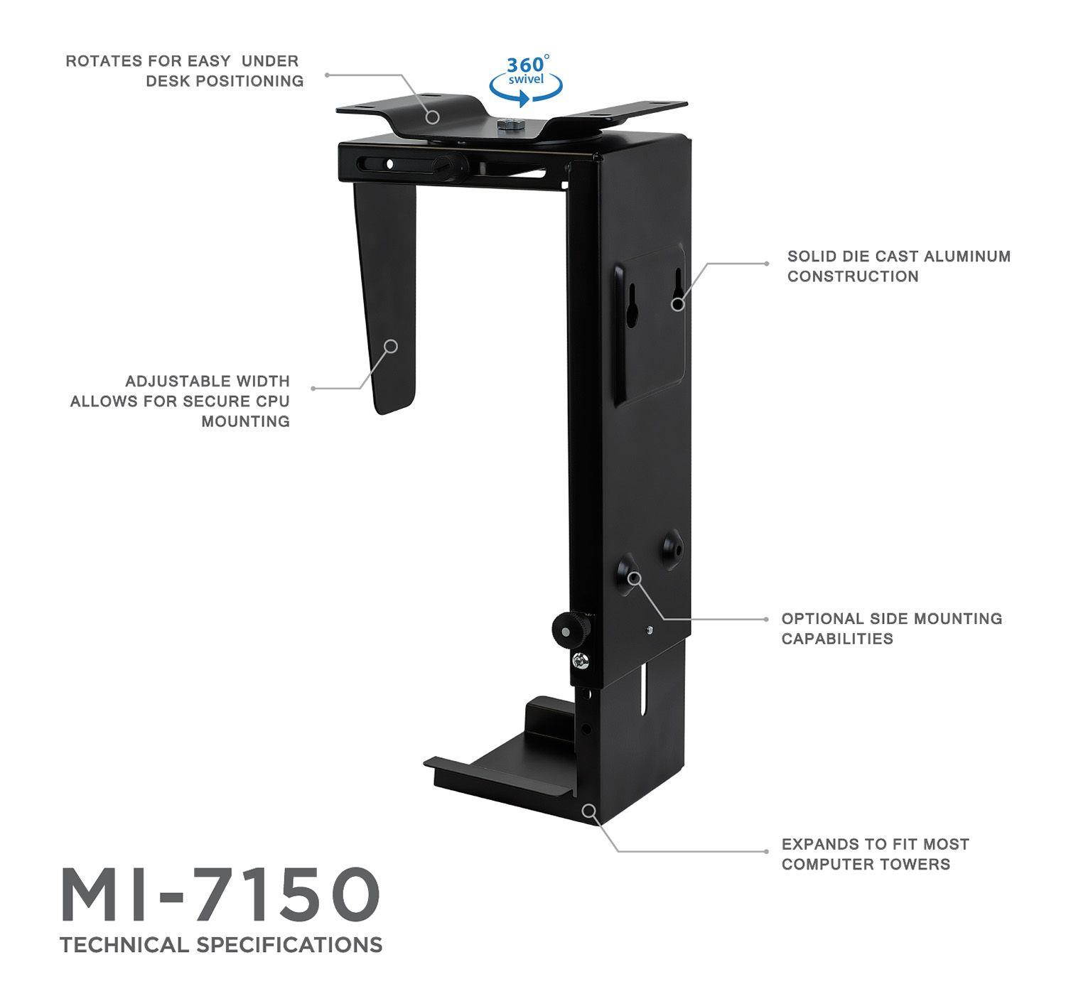 Place your CPU in a convenient and accessible location with the Mount-It! Adjustable Computer Tower Mount. The 360-degree swivel ensures easy access to cables and ports on the back of your CPU. It mounts to the underside of your work surface, to a side panel or to a wall to keep it conveniently accessible. Keep your computer safe by raising it off of the floor, saving it from dirt and dust. Save floor and desk top space, while keeping your computer within reach with this CPU Computer Tower Holder. Constructed with rustproof powder-coated steel for a sturdy build made to last. -Height Limit: 11.8 to 21 inches. -Width Limit : 3.5 to 8 Inches. -Weight Limit: 22 Lbs / 10 kgs.
