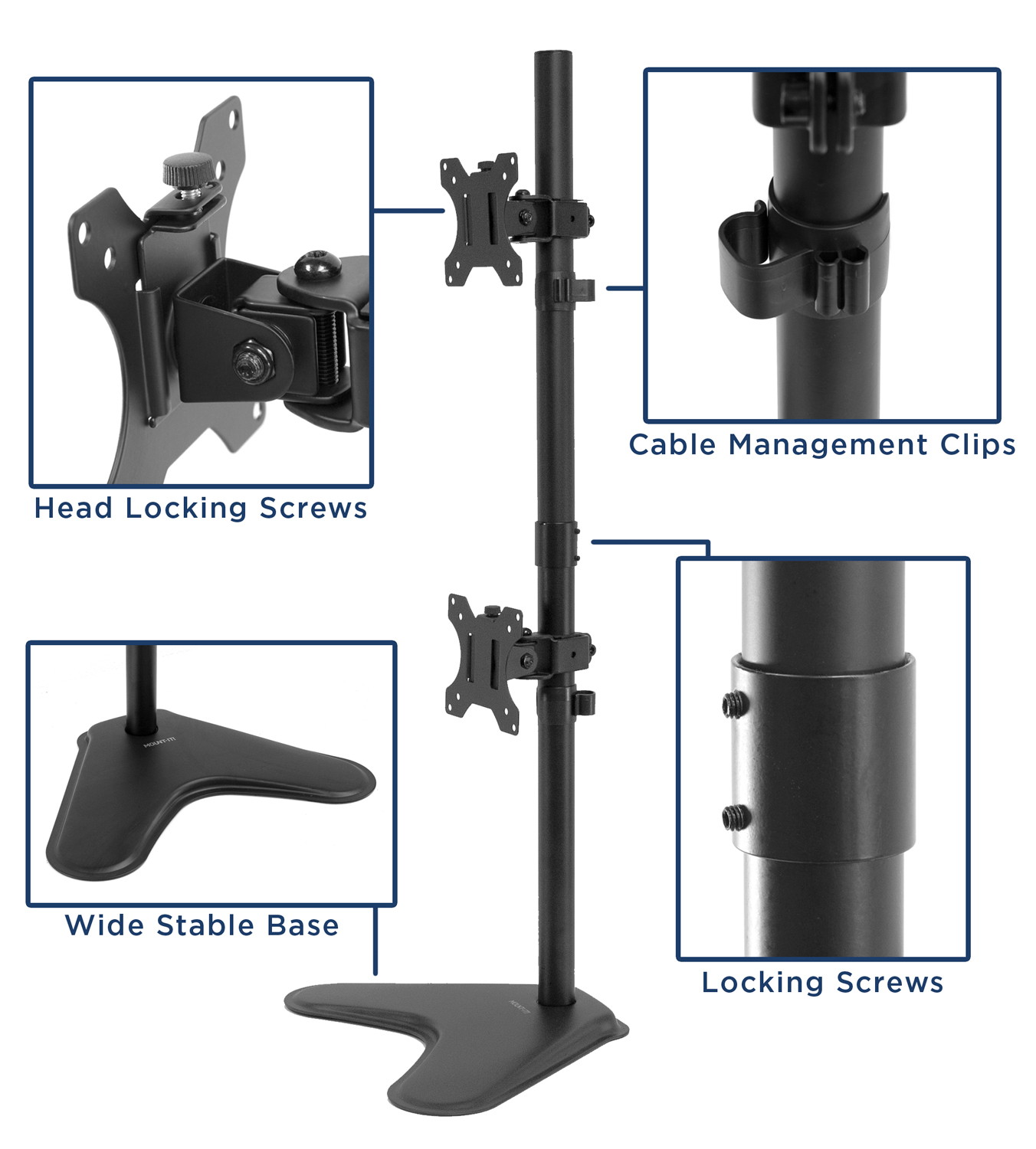 The vertical dual monitor stand places your monitors vertically to maximize desk space. Each monitor head can be independently adjusted along the 35" pole. Along with tilt and swivel, each monitor mounting plate can be rotated 360 degrees for a portrait or landscape orientation. These full motion movements allow you to customize each screen for a better and healthier way to work.