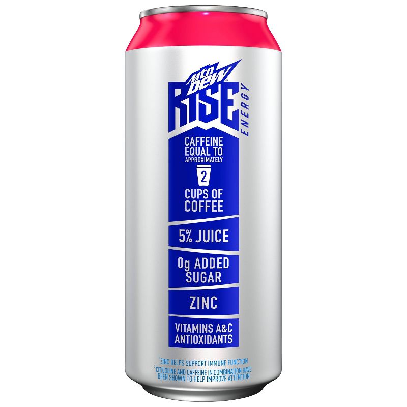 Conquer the morning with Mtn Dew RISE Energy. 25 calories and 180mg caffeine per can, equal to approximately 2 cups of coffee. 5% juice. 0g sugar. Vitamin A & C Antioxidants. Zinc to help support immune function. NOT RECOMMENDED FOR CHILDREN, PREGNANT OR NURSING WOMEN, OR PEOPLE SENSITIVE TO CAFFEINE.