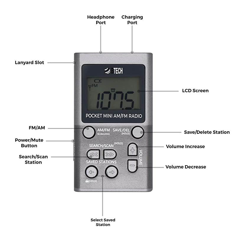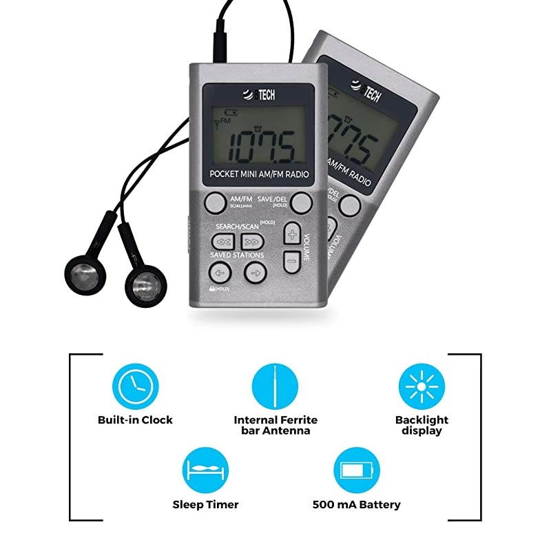 Color: SilverAre you looking for an easy to operate portable radio? A radio that is easy to tune to your favorite station, with great reception and a long-lasting battery? The MPR-AF1 is a simplistic designed portable radio for use while on the go. Listen to your favorite AM or FM radio station while exercising, camping, or just wanting to go out without having to take an expensive device. The MPR-AF1 is an ideal portable radio that allows you to listen to your favorite local AM/FM radio without draining the battery on your phone, while having a long battery itself. Unlike many portable radios, the MPR-AF1 has storage to easily adjust between your favorite presets (up to 58 channels). The MPR-AF1 has an extreme battery life (up to 1 week of average use), great reception, and fits easily into your pocket. Our kit includes two different styles of 3.5 mm stereo headphones that allow you to pick the style most comfortable for you. The choice is clear for choosing the MPR-AF1; compared to other pocket radios - the MPR-AF1 has crisp stereo audio output through the 3.5 mm audio jack. The MPR-AF1 has more features than our competitors, terrific reception, perks like a built in clock, and a long battery life; and is proud to be a US-Based business specializing in radios (US warranty and support is rare to be found).
