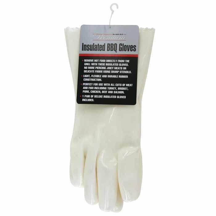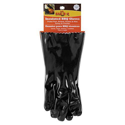 Durable exterior and cloth interior on these barbecue gloves to handle and pull apart beef brisket, pulled pork, deep-fried turkey or salmon. Longer length protects wrists from heat of a grill, smoker, oven or rotisserie. These durable long grilling gloves let you quickly serve meat while it's still hot from the grill. The gauntlet barbecue gloves made famous by celebrity chefs, now available for the home griller. Not for direct use with grill racks, hot pans or accessories. One size fits most. One pair. Wipe clean. Imported.Product Features• Safely grip and remove hot food directly from a grill, oven, smoker or rotisserie• Durable insulated construction to protect hands from heat, pulling apart beef brisket, pork, deep-fried turkey or fish• Light and flexible for dexterity• Longer length to protect hands and forearms• One size fits most