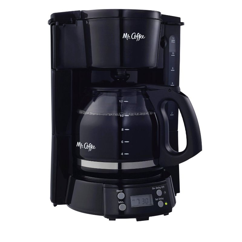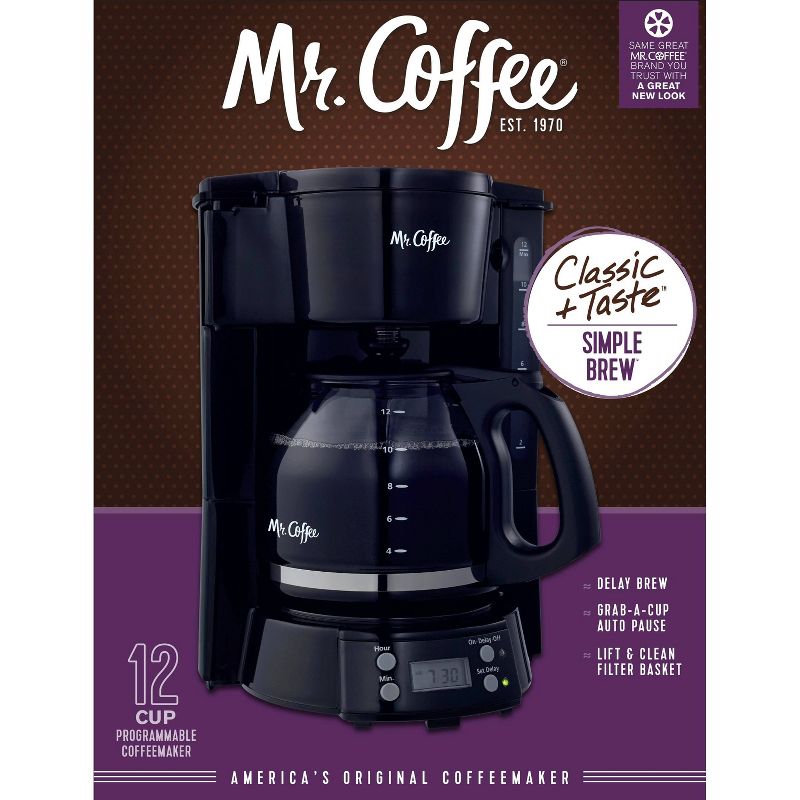 Enjoy great coffee simply made with the Mr. Coffee 12-Cup Programmable Coffee Maker. It features a Delay Brew option, so you can set brewing ahead of time and wake up to fresh brewed, delicious coffee. The Grab-A-Cup Auto Pause feature pauses the brewing cycle so you can pour a cup, and then continues brewing until complete. And after 2 hours on, this convenient coffee maker will automatically shut off until you're ready to use it again.