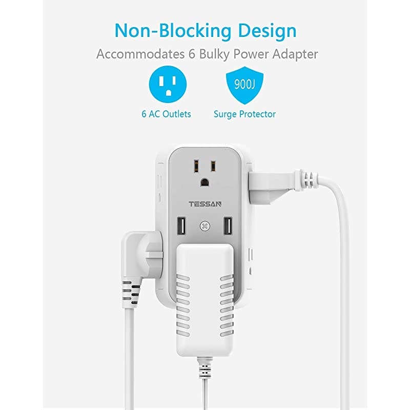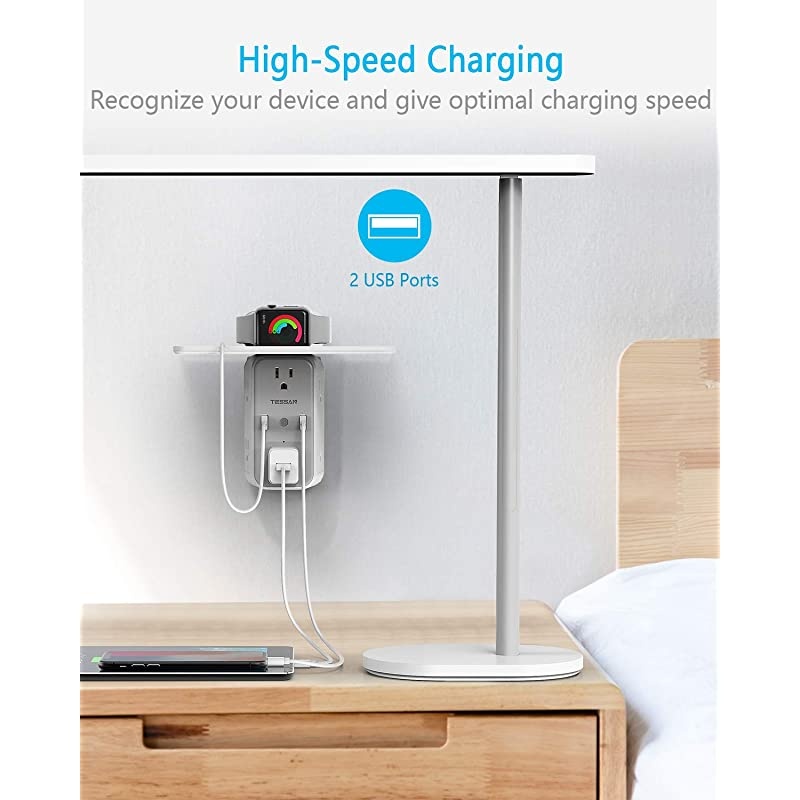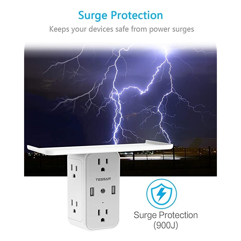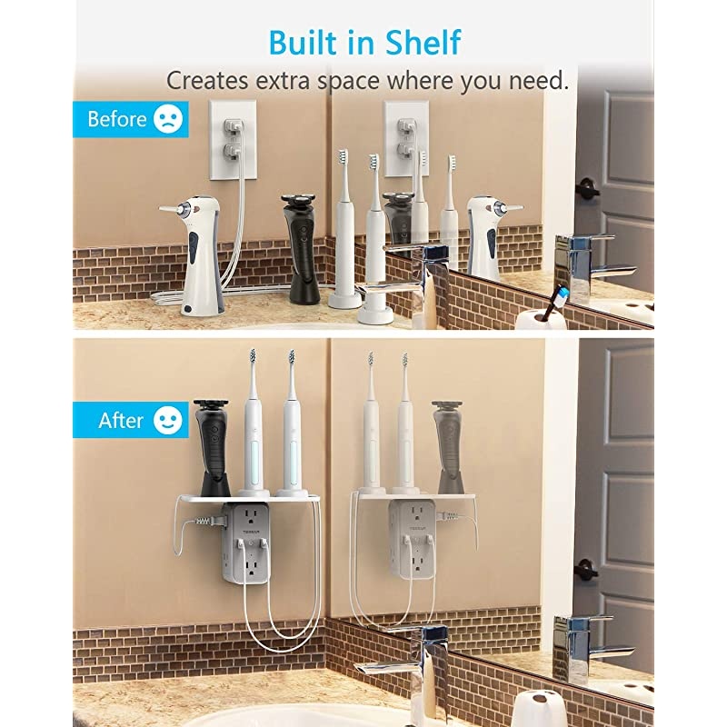 **********EXPAND MORE WALL OUTLETS-Expand 2 power outlets into 6 surge-protected electrical outlets and 2 USB ports that can power your home or dorm electronics. Single USB charger can charge up to 2.4A, fit for smartphones, tablets, E-readers, and more USB devices. *****WIDE-SPACE PLUG SPLITTER-Separated enough for spacious plugs without blocking each other, suitable for your household appliances with big plugs, such as refrigerator/coffee maker/vacuum cleaner. *****EXTRA SPACIOUS OUTLET SHELF-Extra 7.87 * 3.35" shelf space enables your electric toothbrush and razor to be placed on the shelf while charging. Great for placing items to avoid getting wet and keep your bathroom neat and tidy.