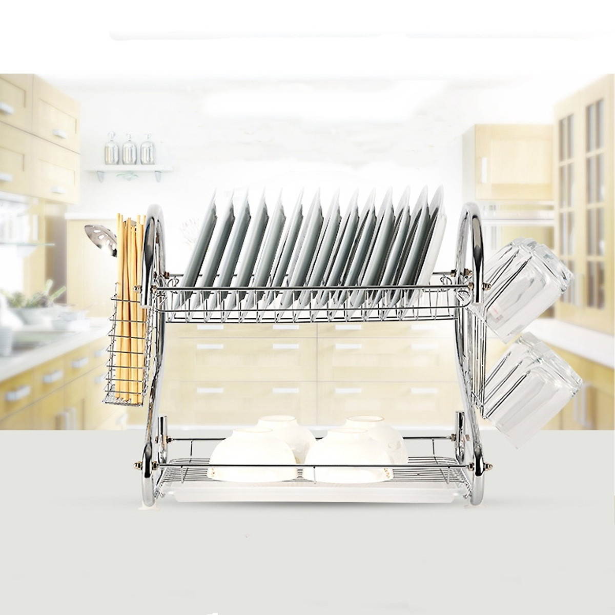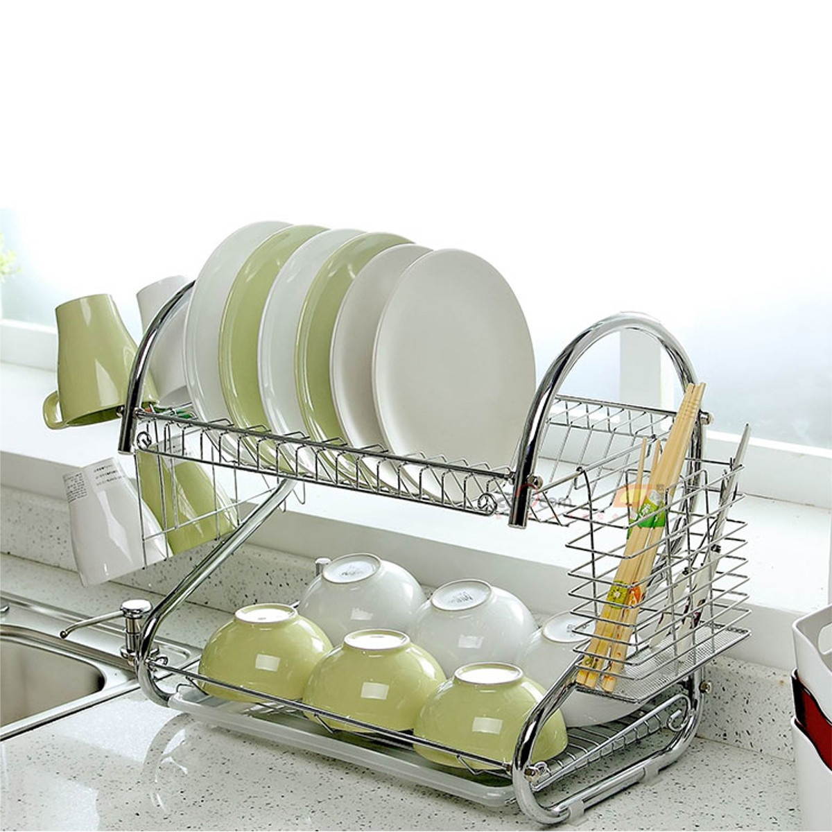 Description Multifunction 2Tie Plate Cutlery Cup Drainer Holder Rack Drip Tray Chrome Sliver