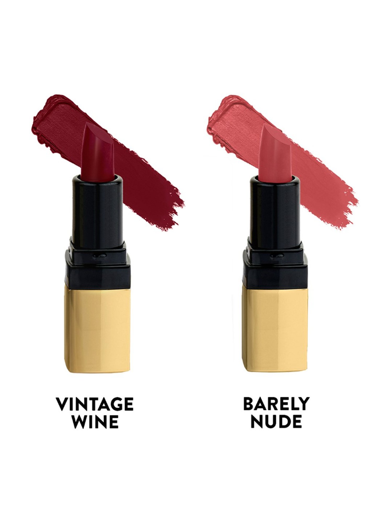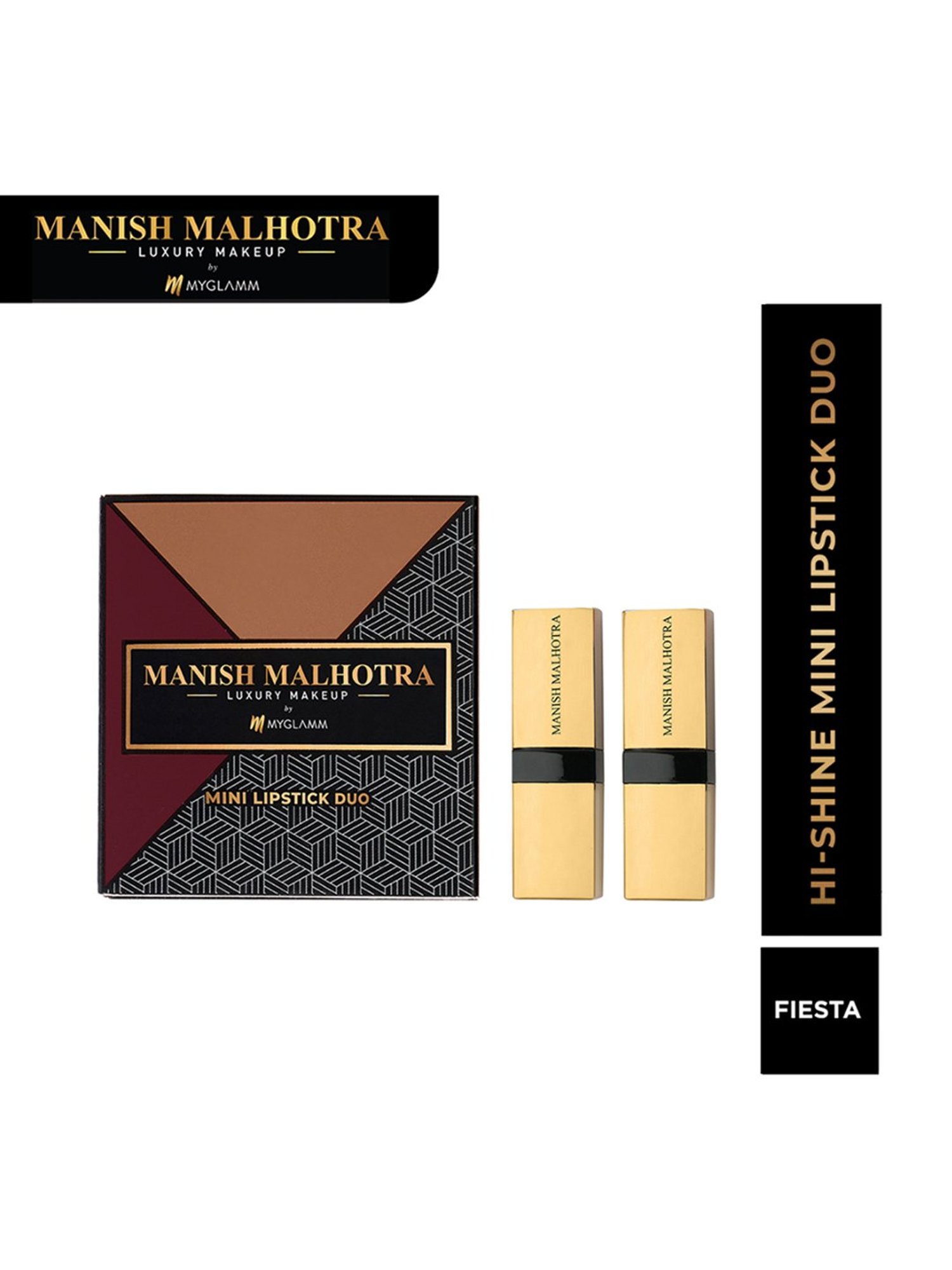 Own every occasion from AM to PM with Manish Malhotra Fiesta Hi-Shine Mini Lipstick Set. Its high-pigment, lustrous formula adds another dimension to your lips while providing UVB protection. The smooth texture glides like decadent butter, delivering a head-turning pout. Featuring two bold shades - Vintage Wine and Barely Nude - in a travel-friendly size for on-the-go glam. The duo comes in a premium colour-block box, making it the perfect gift for your loved ones. This combo contains 2 x Hi-Shine Mini Lipstick - Vintage Wine and Barely Nude each 1.5 gm.