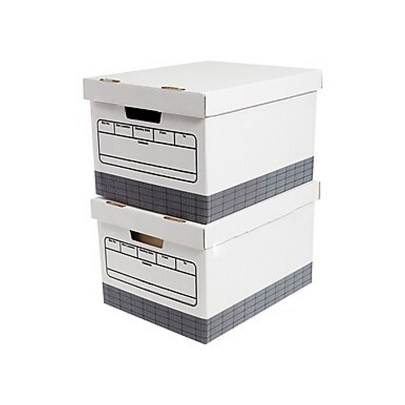 Heavy Duty, Durable Corrugated Boxes, Letter/Legal Size, White/Gray, 4/Carton (2522301). Heavy-duty durable boxes featuring double-sided, double-bottom construction for stacking, storage. White with gray corrugated cardboard is sturdy and lightweight. Can be used for either letter or legal files. Dimensions: 9.8"H x 12"W x 15"D. Sold as 4/Carton.
