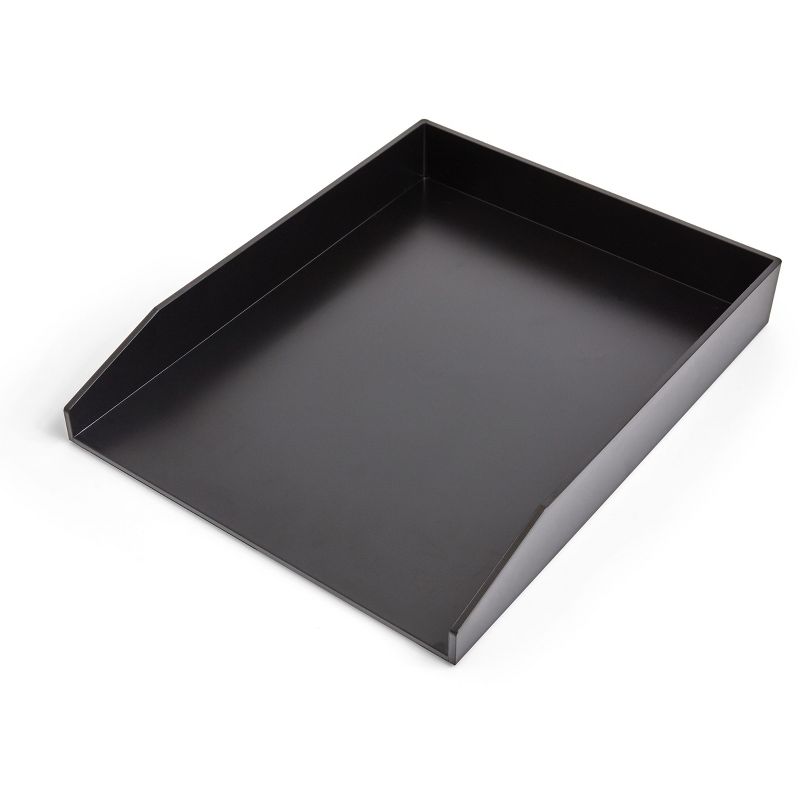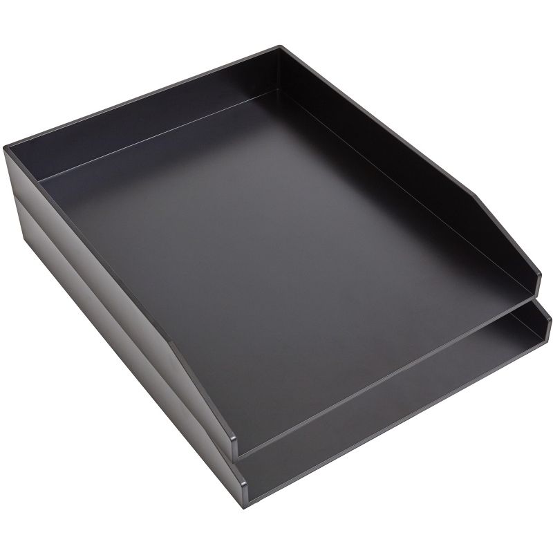 Eliminate paper clutter in your workspace with this 2-pack of black front-load letter trays. Take a simple yet inspired approach to desktop organization with these letter trays. The stacking design lets you create a personalized paperwork storage system, and the sleek black hue brings a modern look to your office. These black front-load letter trays hold up to 200 sheets of paper, so you can keep forms, contracts, and loose pages in one central location. Stackable front load letter tray helps keep your desk and papers organized. Black matte finish plastic letter tray holds up to 200 sheets without bowing. Use stand alone or mix and match with other pieces. Each tray measures 12.24"L x 9.8"W x 1.75"H and holds up to letter sized paper. Comes with 2 letter trays. Create a custom, tiered desk organizer when stacked with other desk accessories. Stackable front load letter tray helps keep your desk and papers organized. Black matte finish plastic letter tray holds up to 200 sheets without bowing. Use stand alone or mix and match with other pieces. Each tray measures 12.24"L x 9.8"W x 1.75"H and holds up to letter sized paper. Comes with 2 letter trays. Create a custom, tiered desk organizer when stacked with other desk accessories. Sold As 2/Pack.